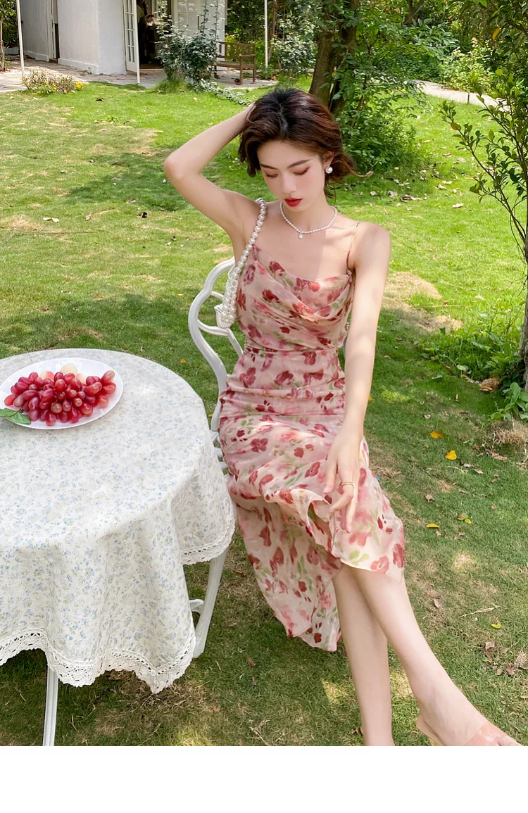 vmtvr 2024 Elegant Luxury Party Evening Dress Summer Pink Floral Pleated Sling Long Dress Women Fashion Bodycon Casual Beach Sundress