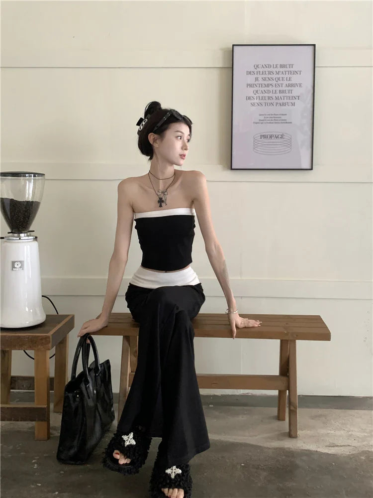 vmtvr 2024 New Temperament Fashion Gyaru Set Women Summer Contrast Color Tube Top Vest Slightly Flared Trousers Two-piece Set Fashion