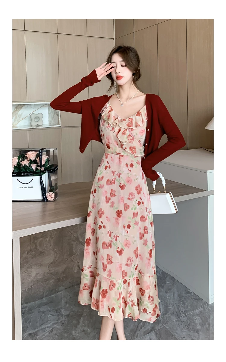 vmtvr 2024 Pink Floral Chiffon Chic Ruffled Sling Dress Women Elegant Casual Beach Dress Sets Summer Korean Fashion Casual Party Dress