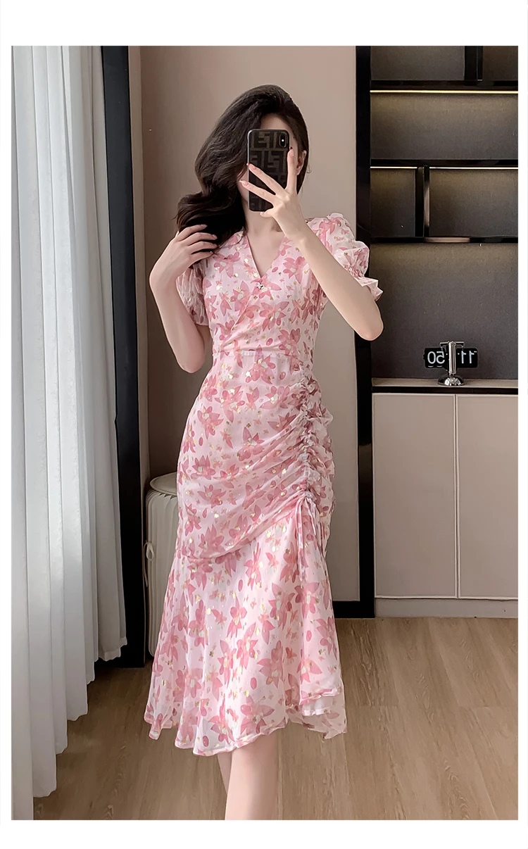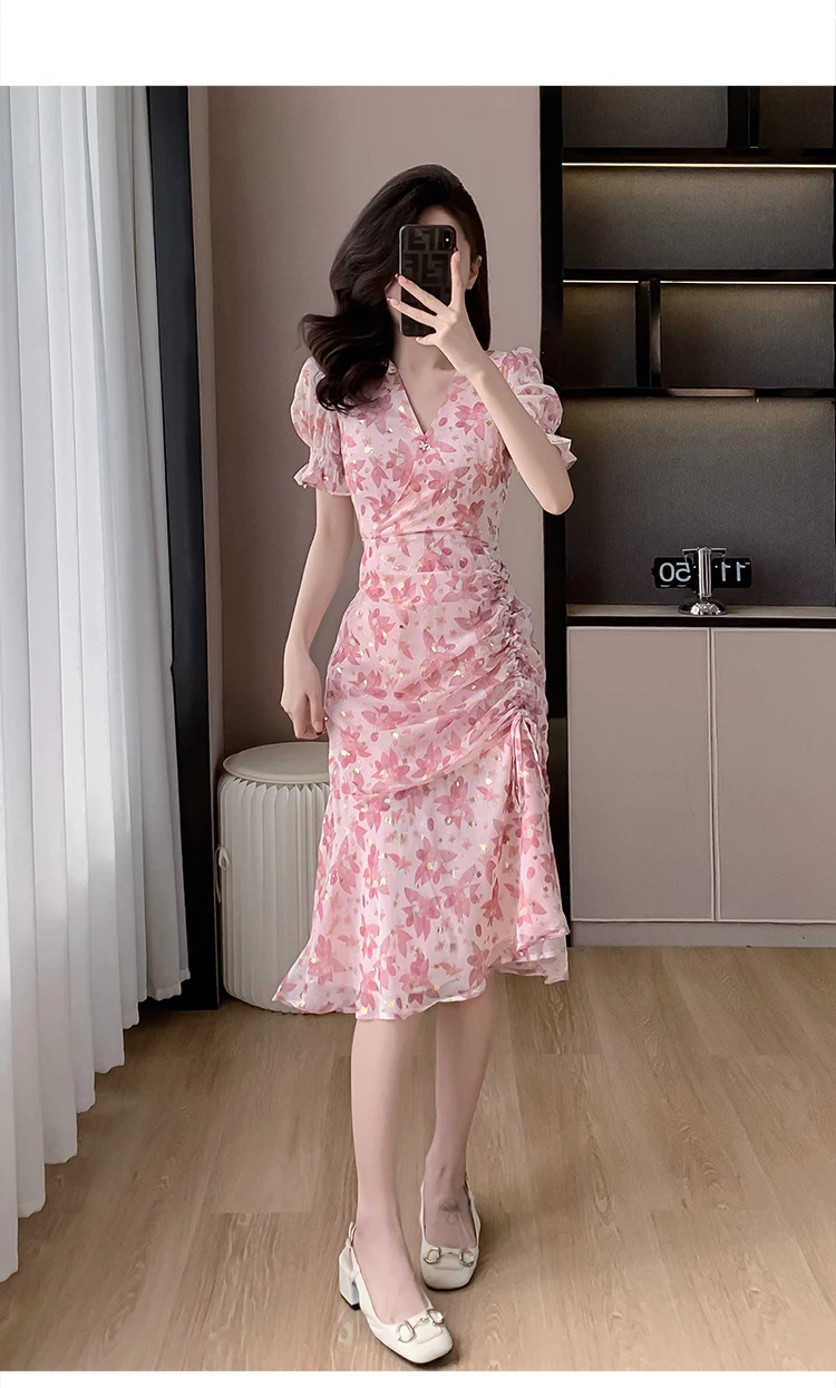vmtvr 2024 Pink Floral Chiffon Sequins Luxury Prom Clothes Women Short Sleeve V-Neck Casual Ruffled Dress Summer Korean Fashion Dress