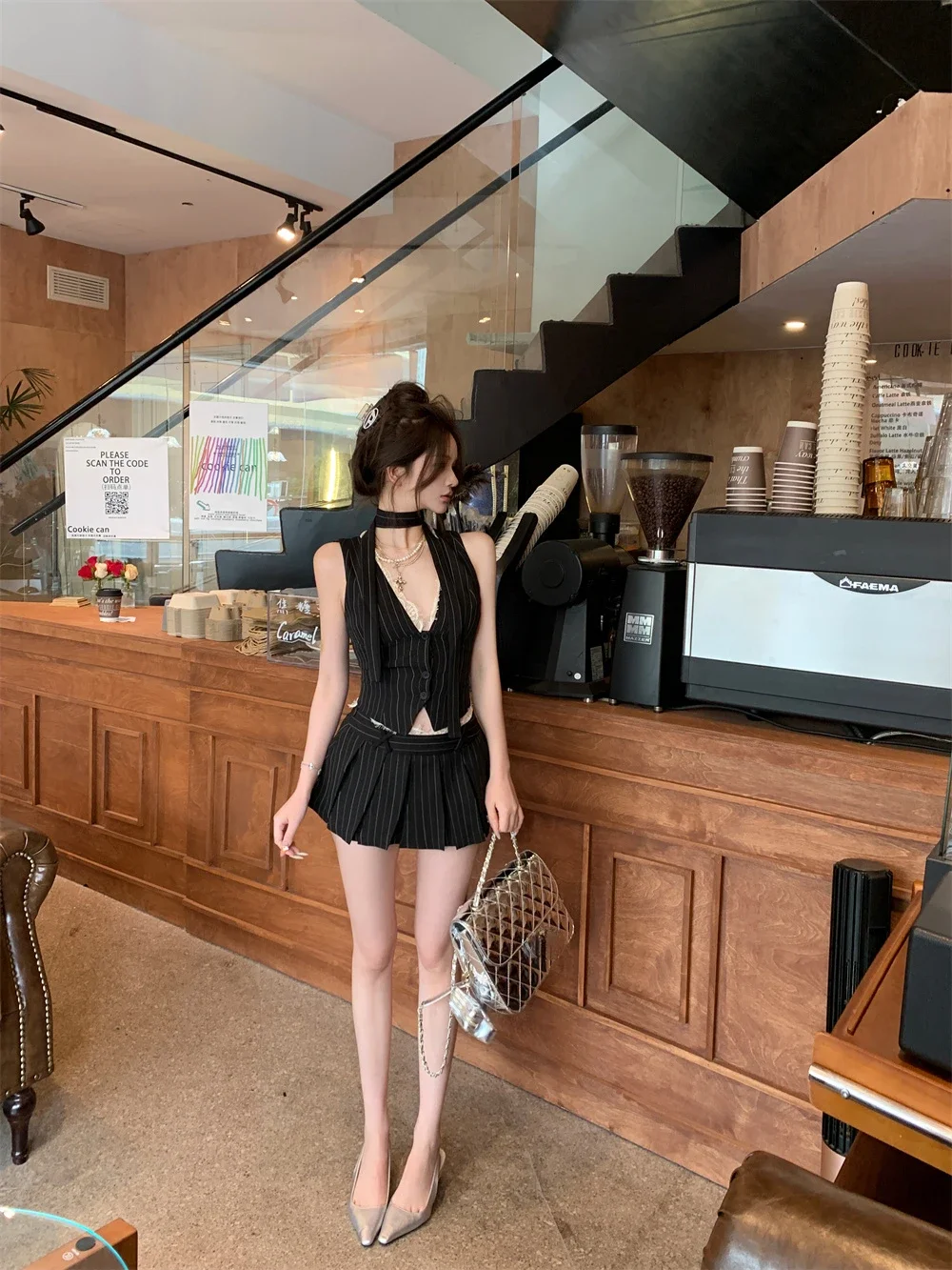 vmtvr 2024 Summer 2 Piece Skirt Set V-neck Lace Patchwork Striped Casual Camisole Women + High Waist Pleated A-line Skirt Vintage Suit
