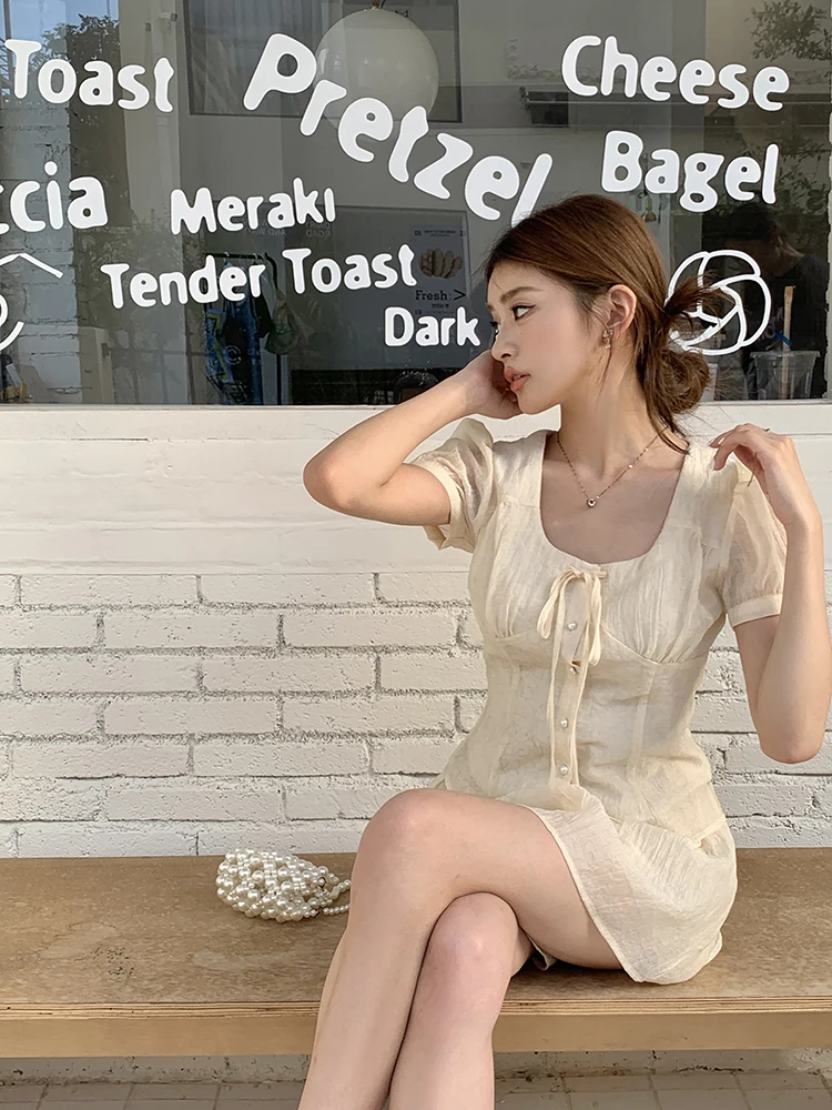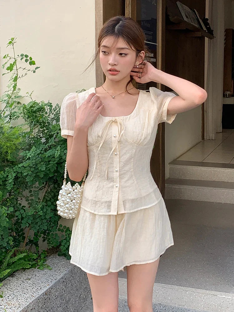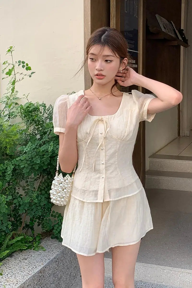 vmtvr 2024 Summer New French Square Collar Short-sleeved Shirt Women A Line Skirt Shorts Texture Fashion Suit