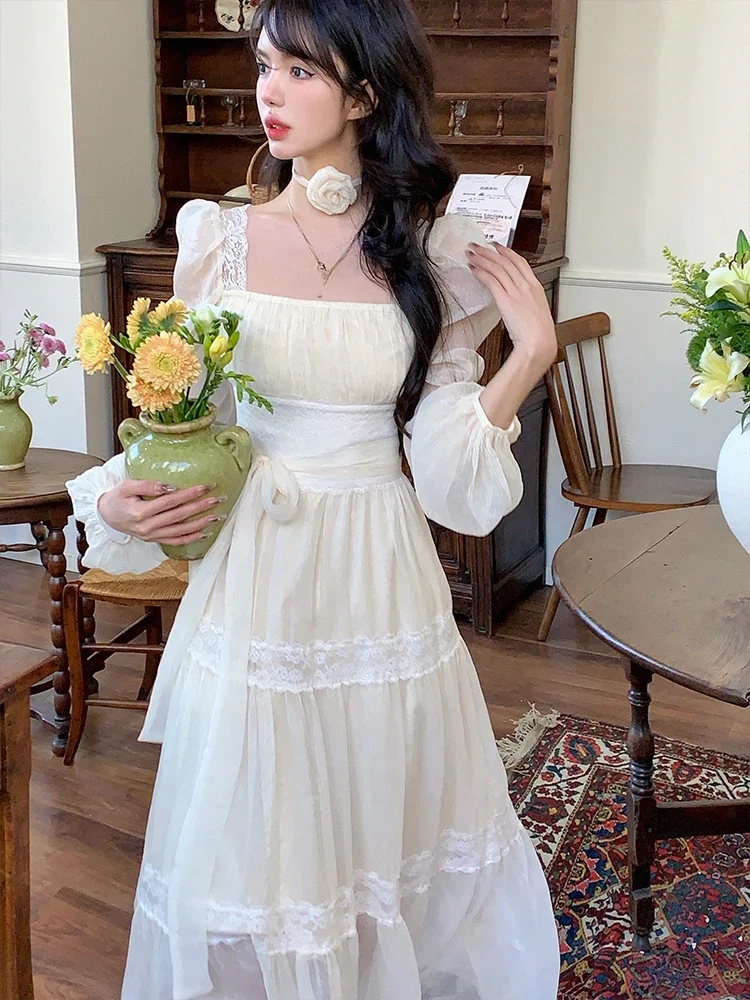 vmtvr 2024 Summer Woman French Elegant Lace Midi Dress Party Long Sleeve Korean Fashion Dress Beach Chiffon Fairy Slim Dress Chic