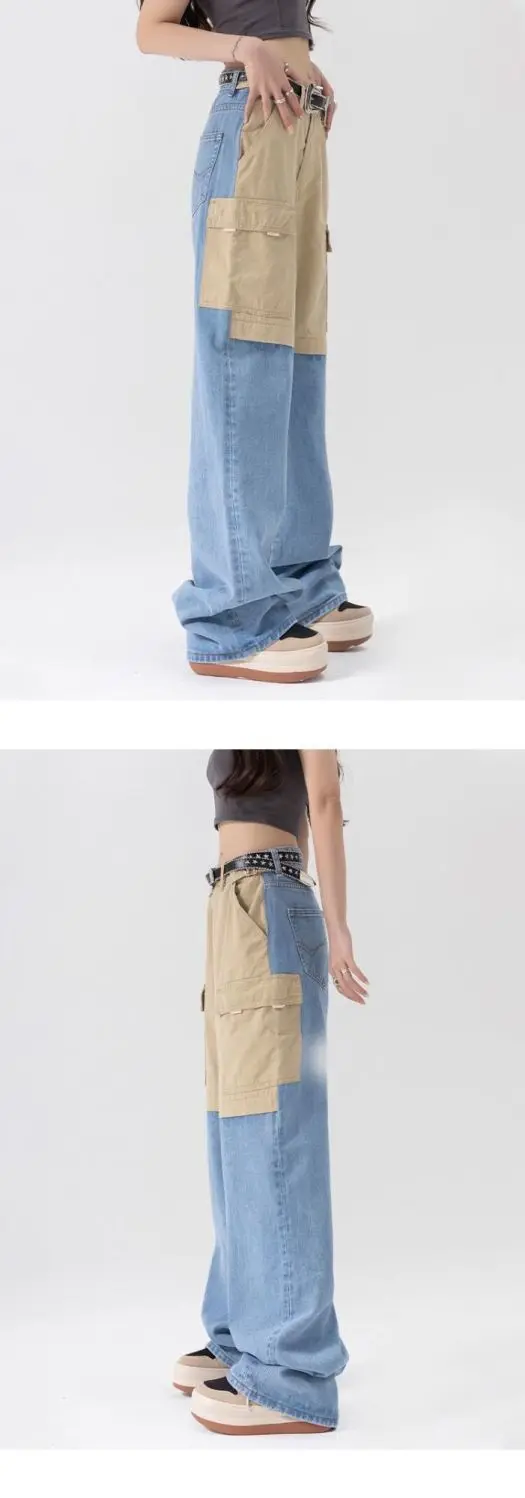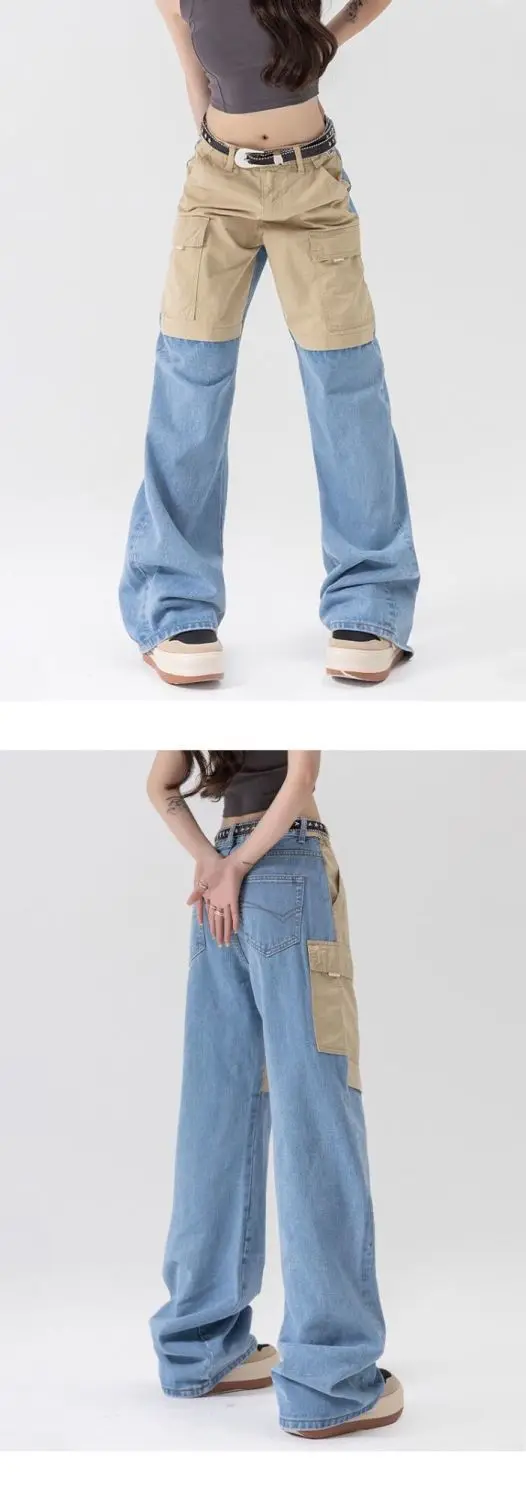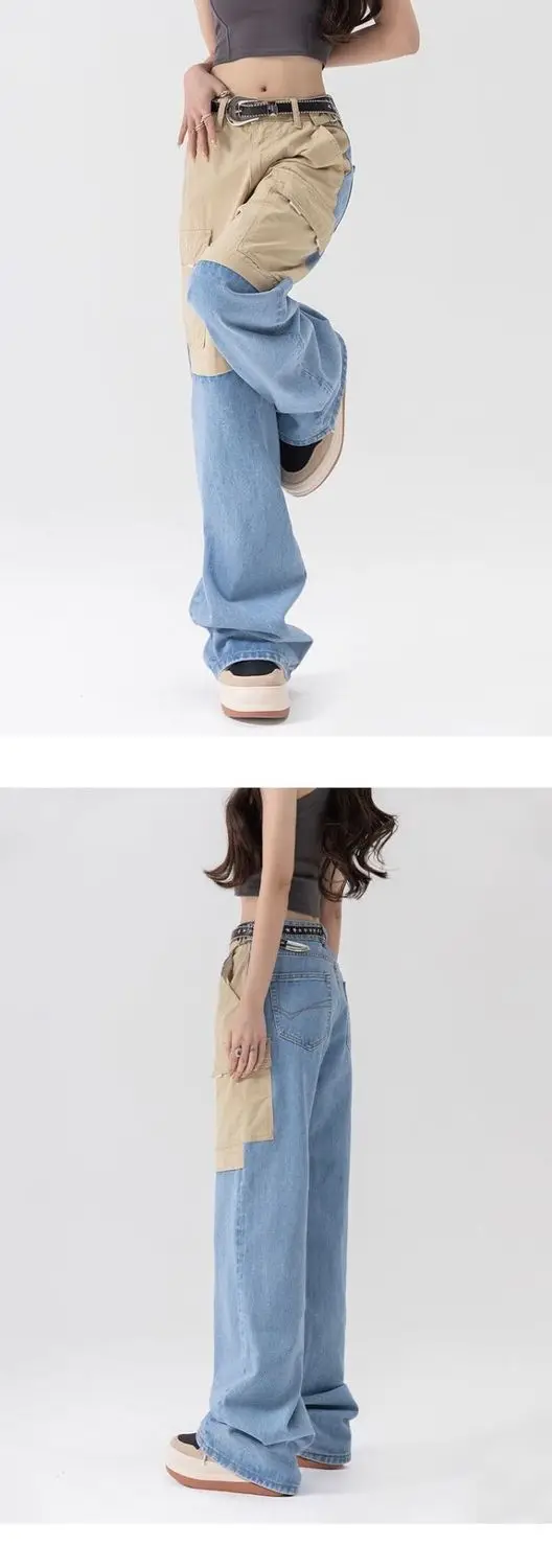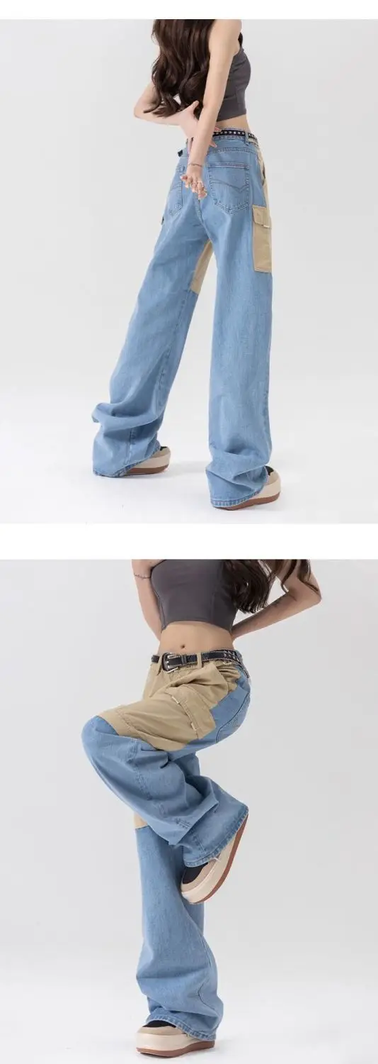 vmtvr American Fashion Spicy Girls Contrast Color Wide Leg Jeans Women's Summer Thin Design Button Pockets Zipper Straight Pants