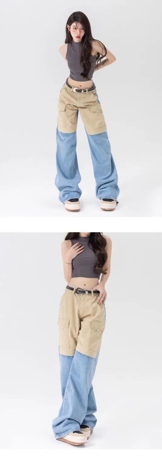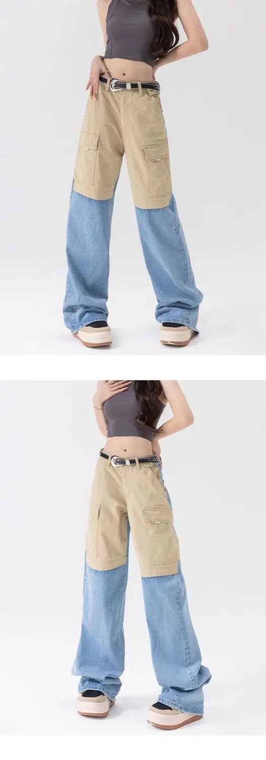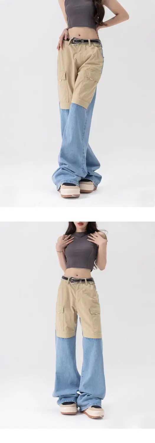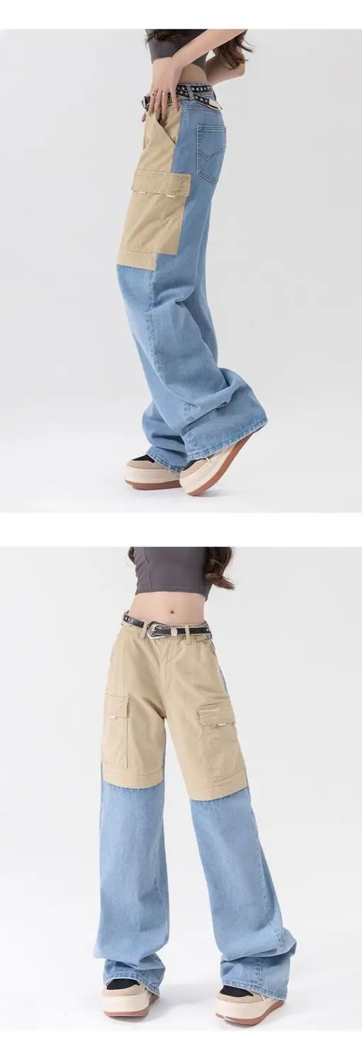 vmtvr American Fashion Spicy Girls Contrast Color Wide Leg Jeans Women's Summer Thin Design Button Pockets Zipper Straight Pants