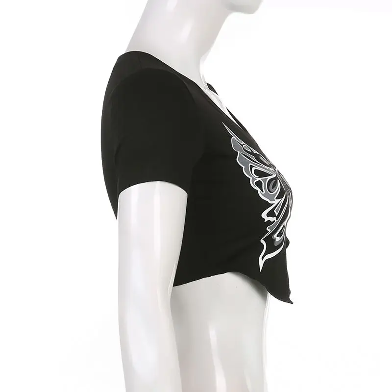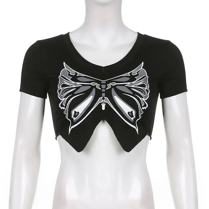vmtvr American Vintage Butterfly Graphic Women Irregular T-shirt V-Neck Spicy Girl Summer Sexy Slim Versatile Short Sleeve Crop Tops