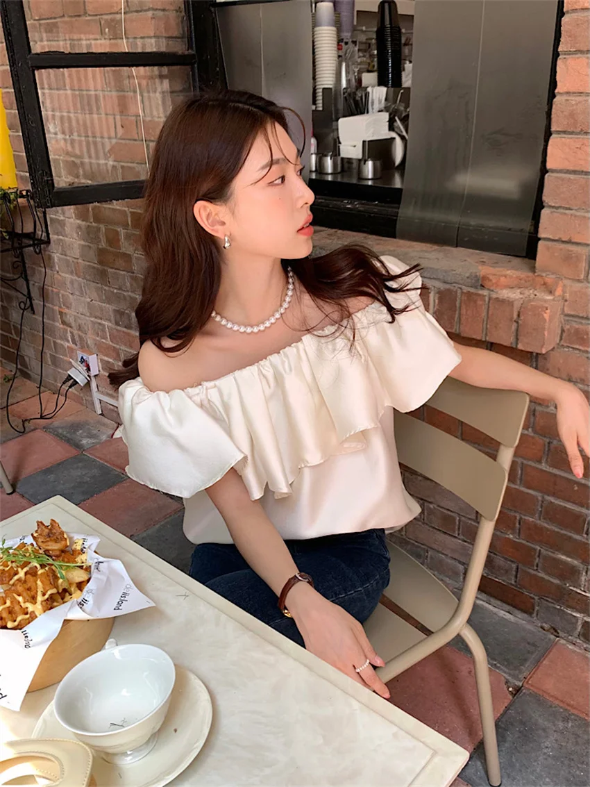 vmtvr Apricot Blouses Women Slash Neck Elegant Chic Lady Office Wear Off Shoulders Sexy Summer Short Sleeve Slim New