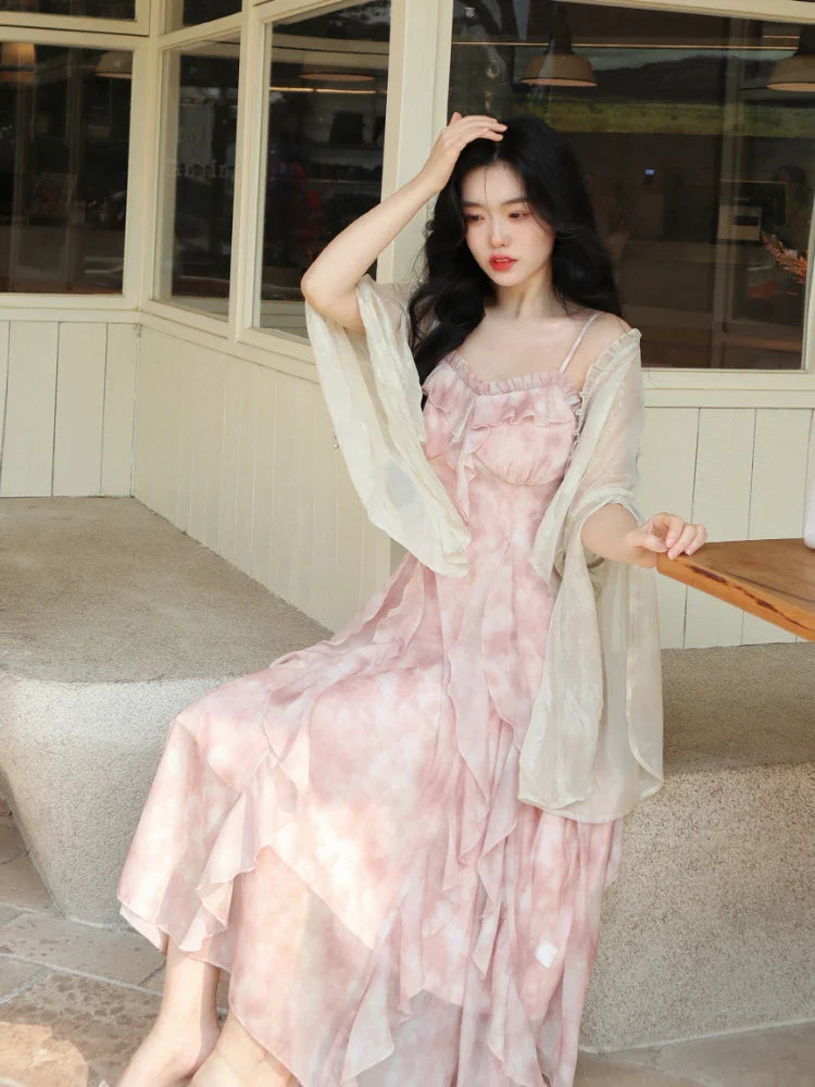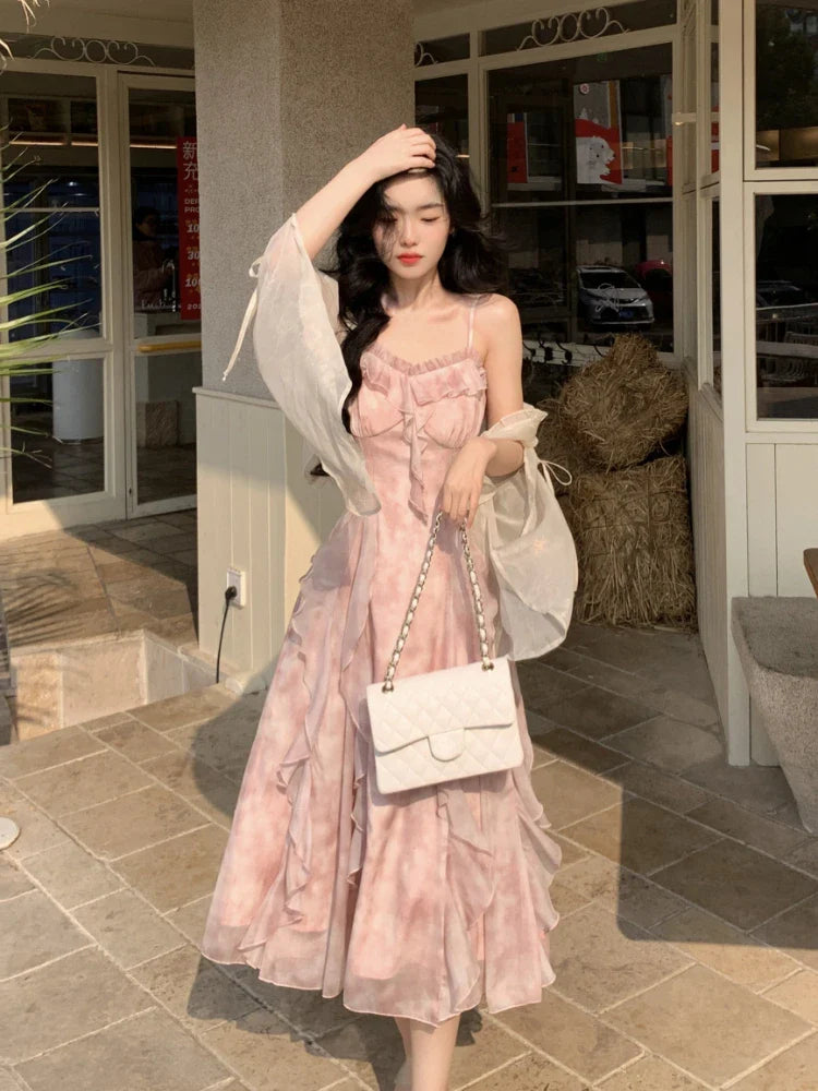 vmtvr Casual Fairy Floral Strap Dress Women Chiffon Elegant Evening Party Midi Dress Ruffle Sweet Korean Dress Women Sweet Summer