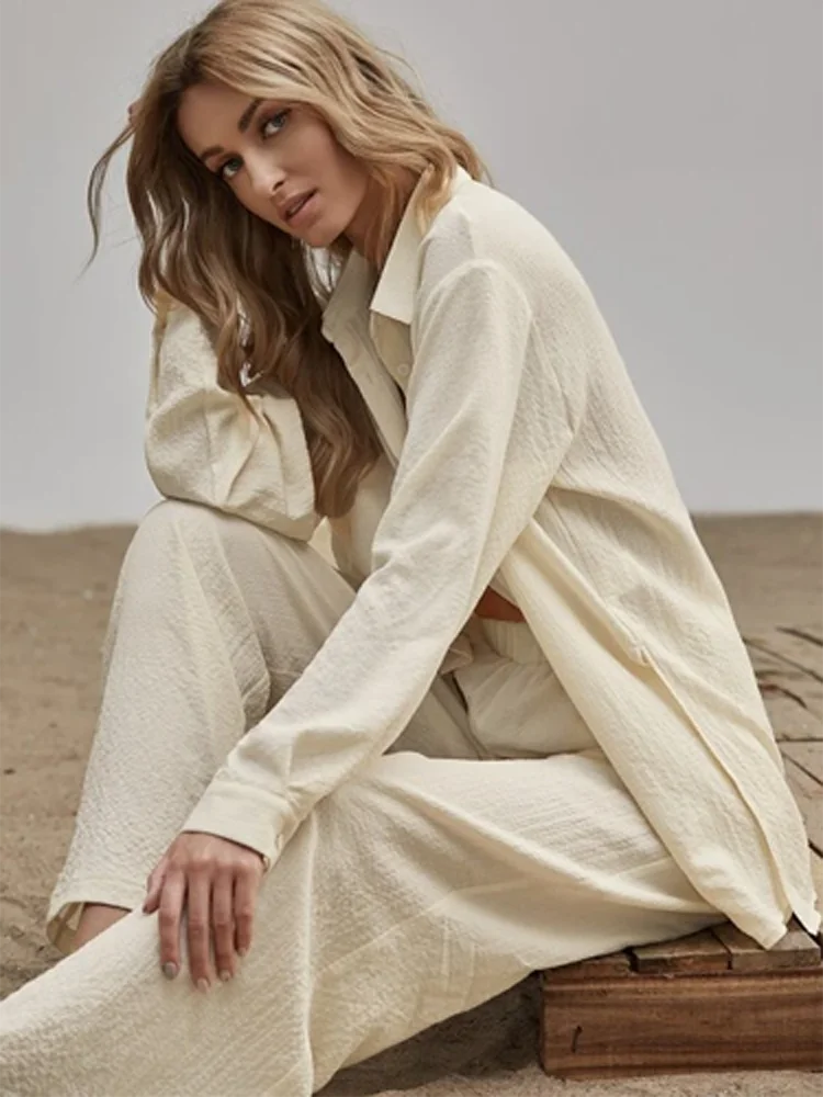 vmtvr Cotton Linen Long Sleeved Temperament Commuter Suit Single Breasted Slit Shirt & Wide Leg Pants Lady 2pc Set Summer Loose Outfit