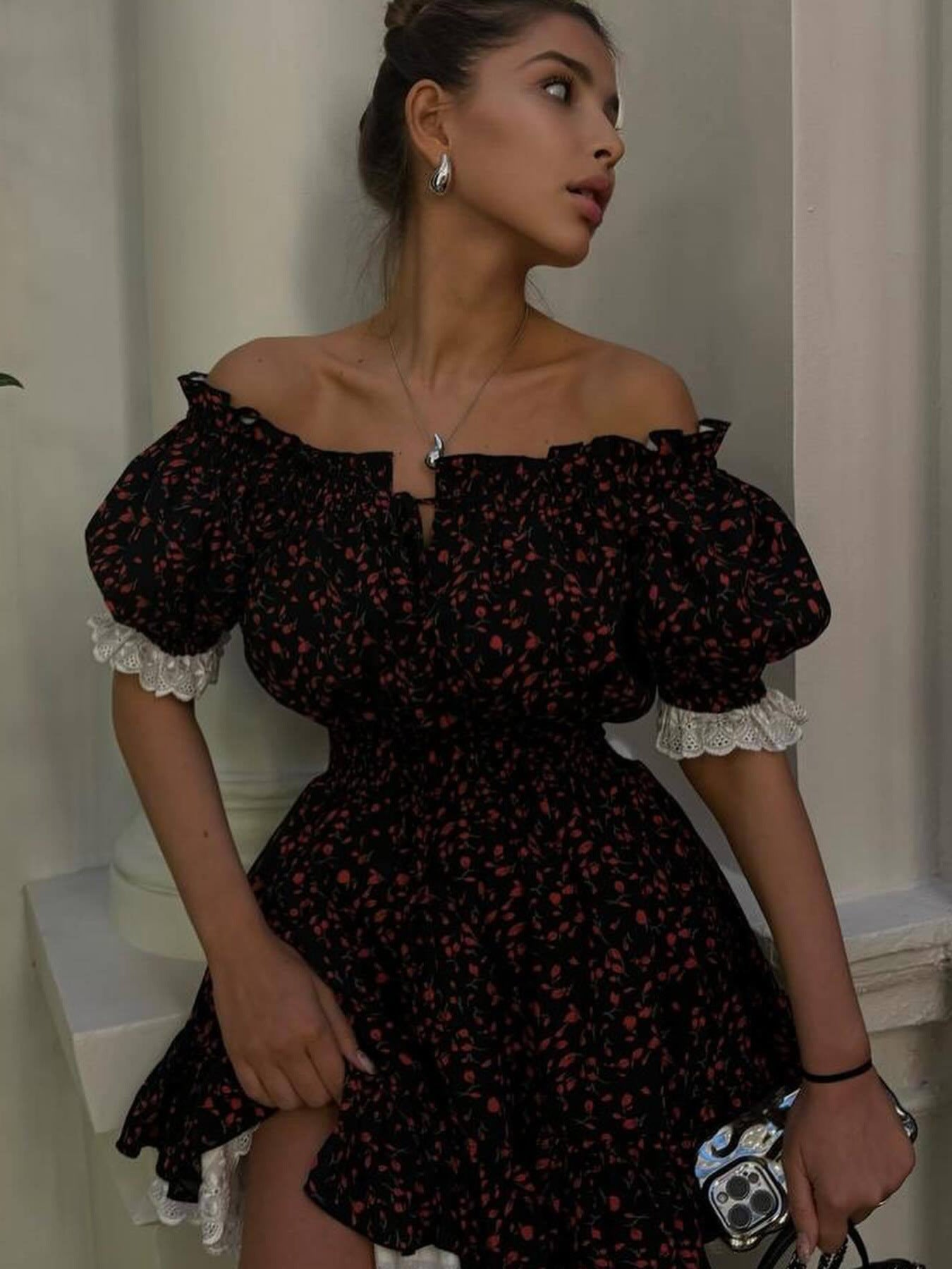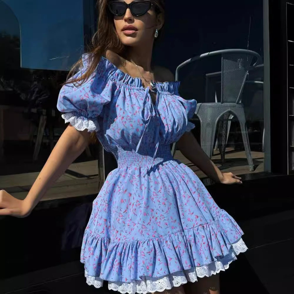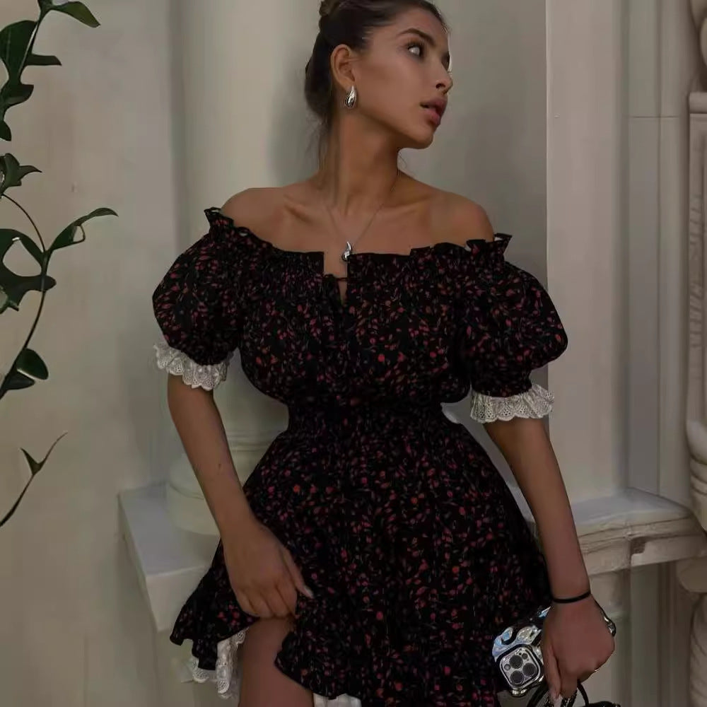 cybergoth dress to impress Sweet Puff Sleeve Dress Women's Summer Neckline Lace Stitching Floral Skirt Women