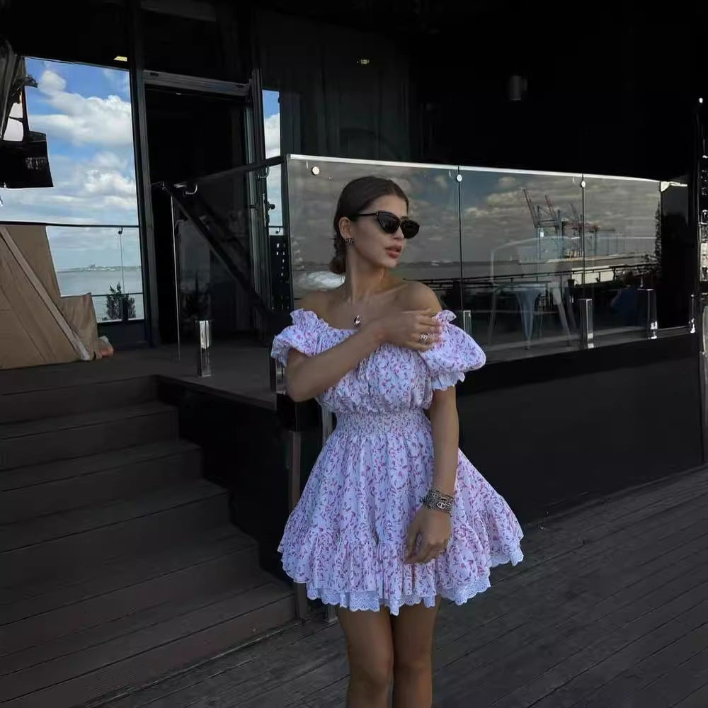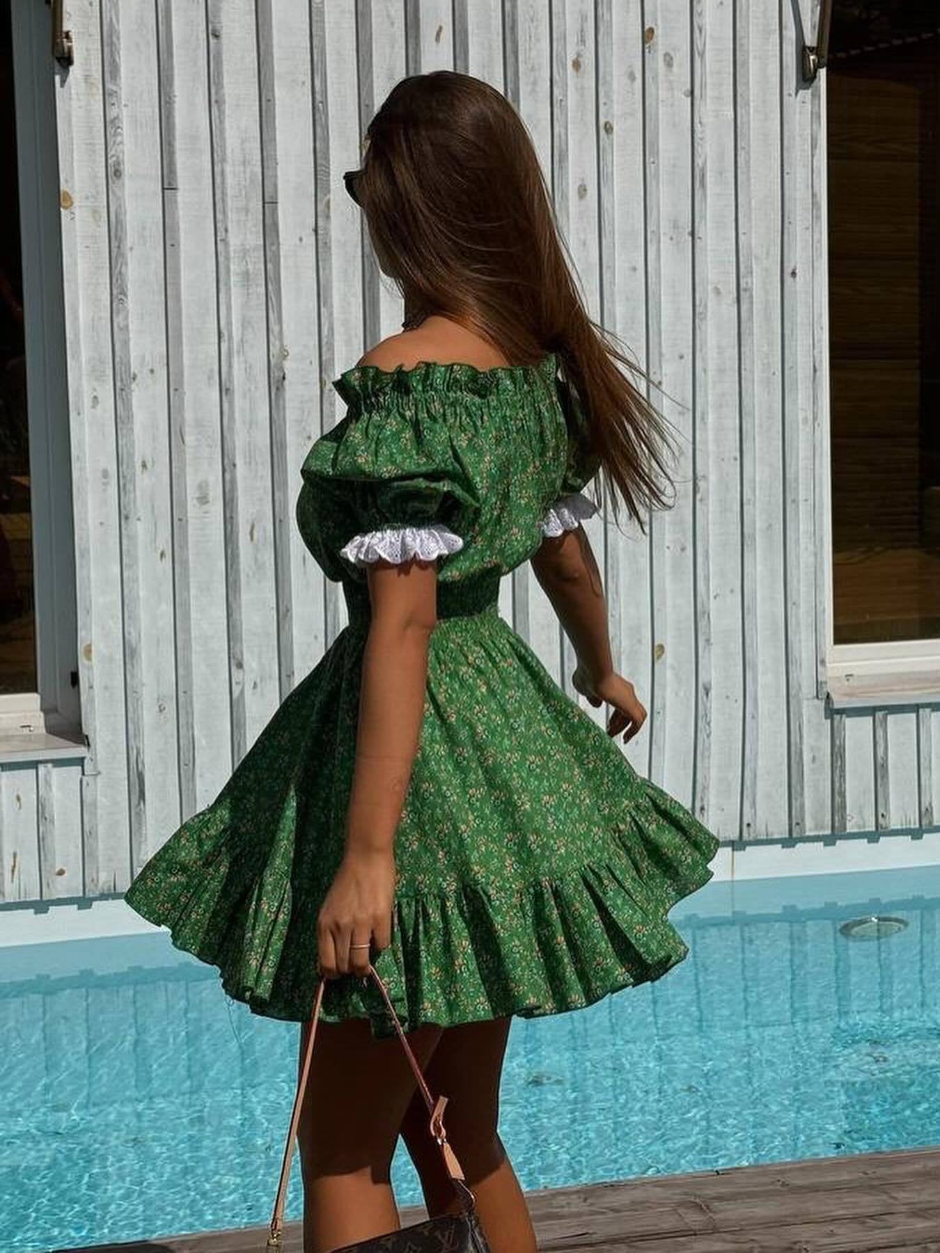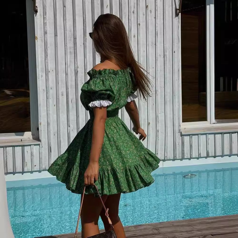 cybergoth dress to impress Sweet Puff Sleeve Dress Women's Summer Neckline Lace Stitching Floral Skirt Women