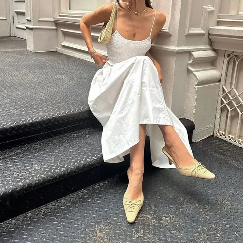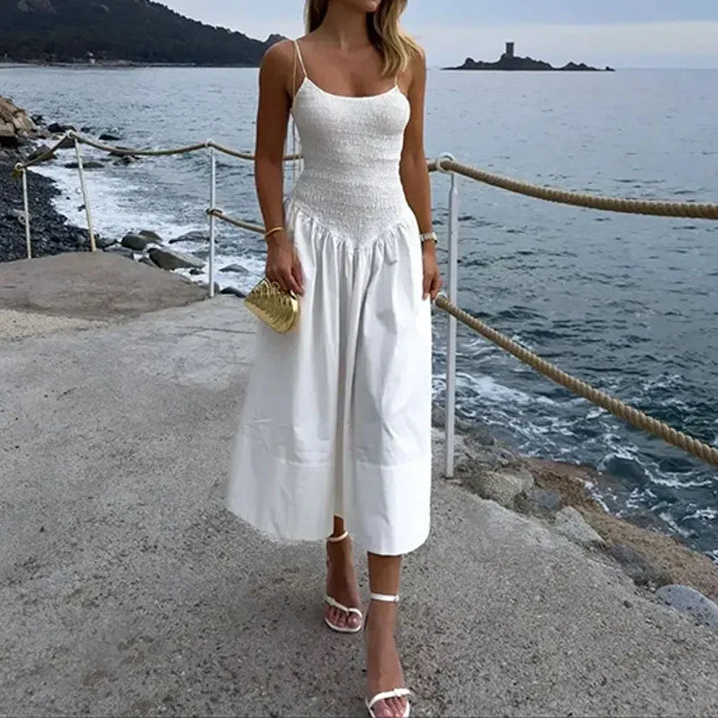 vmtvr Elegant Sleeveless High Waist Beach Dress 2024 Fashion Off Shoulder Pleated Holiday Dress White Summer Strap Long Dress