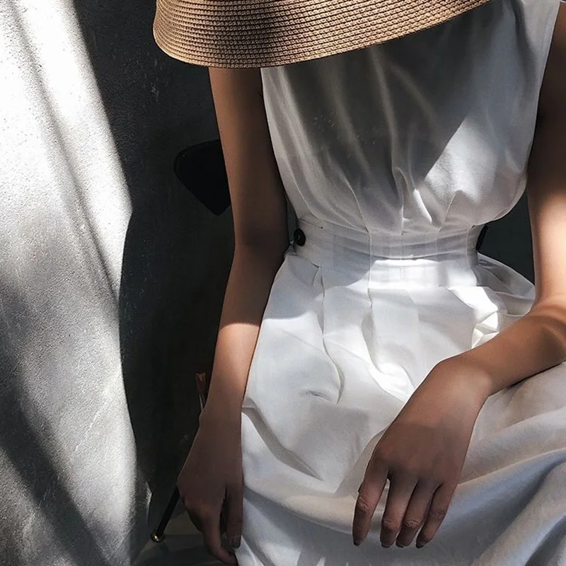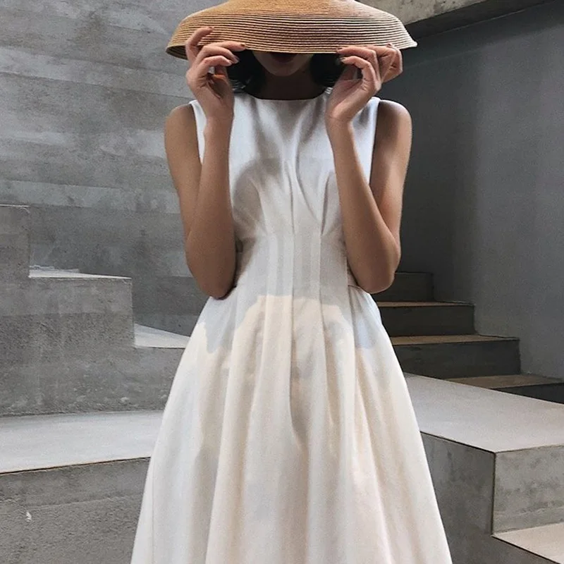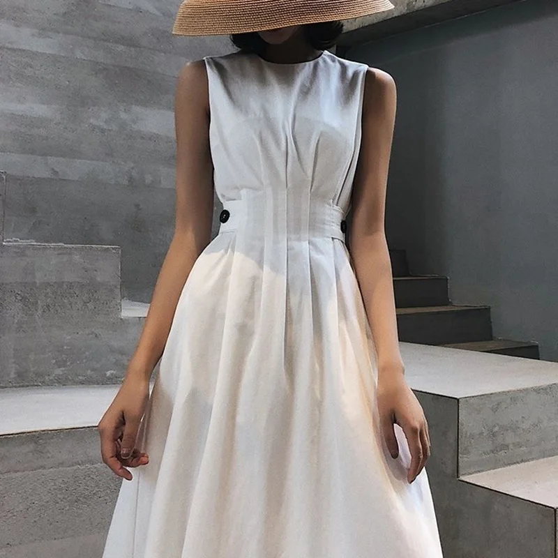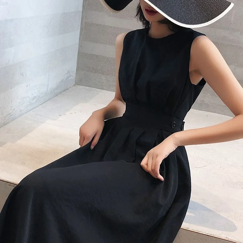 vmtvr Elegant Women Black Dress Korean Fashion Female Waist Midi Dress Hepburn Style Button A Line Sleeveless Dresses Summer New