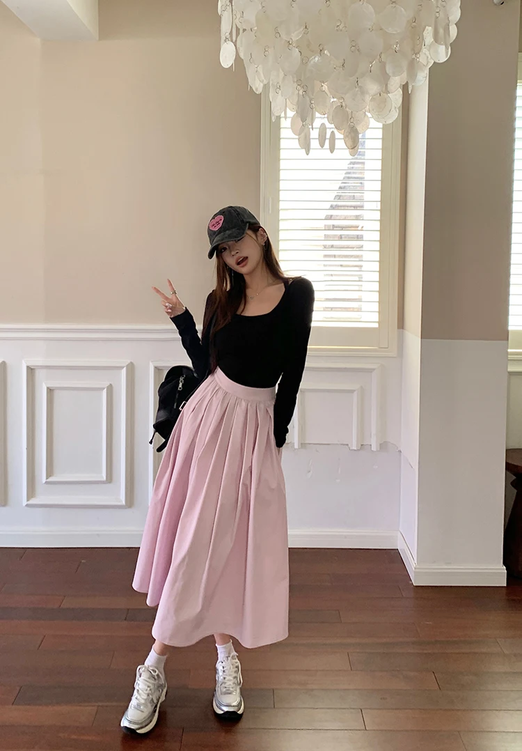 vmtvr Elegant Women Pockets Pleated Skirts For Ladies 2024 Spring Summer A-Line Loose Casual High Waist Midi Skirt SK25