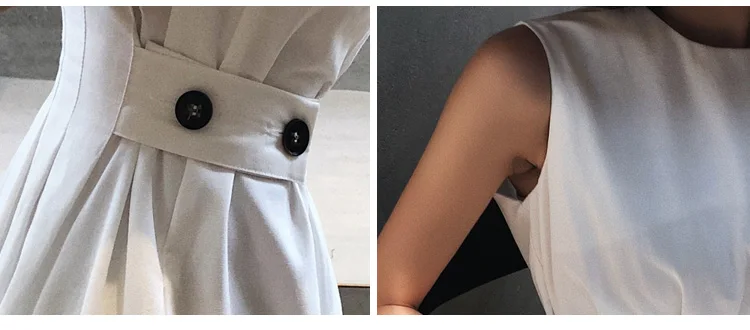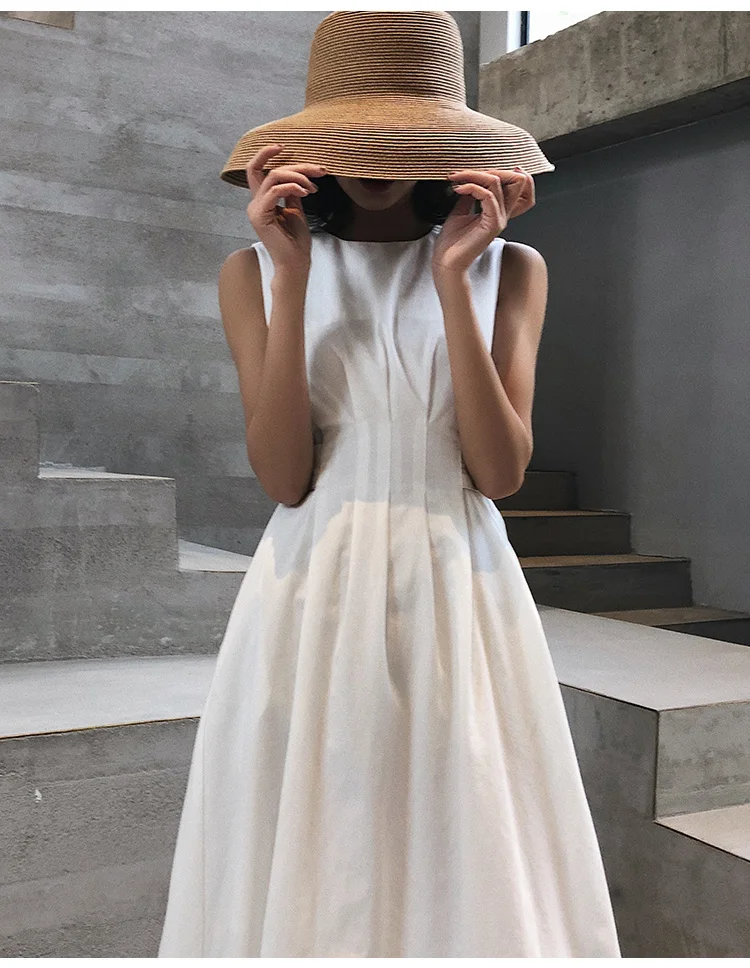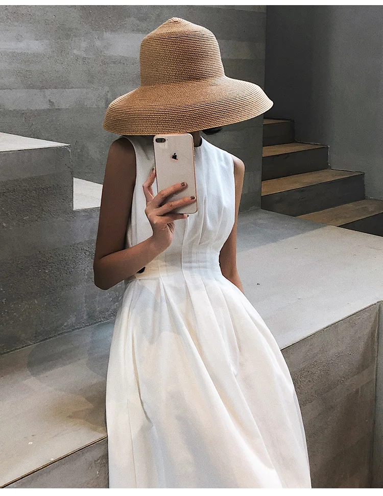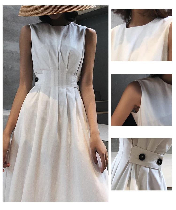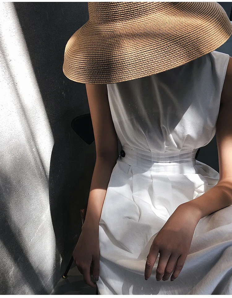 vmtvr Elegant Women White Loose Pockets Casual O-Neck Waist Dress Office Ladies 2024 Summer Sleeveless Midi Dress Vestidos
