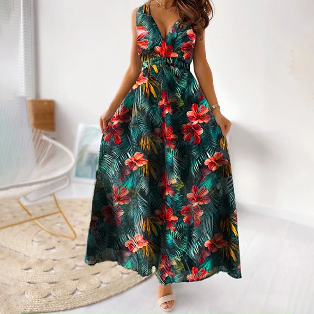 vmtvr Fashion Floral Dress for Women Clothing 2024 Summer Vacation Beach Sundress Elastic Waist Sexy Flowers Skirt Female Vestido Robe