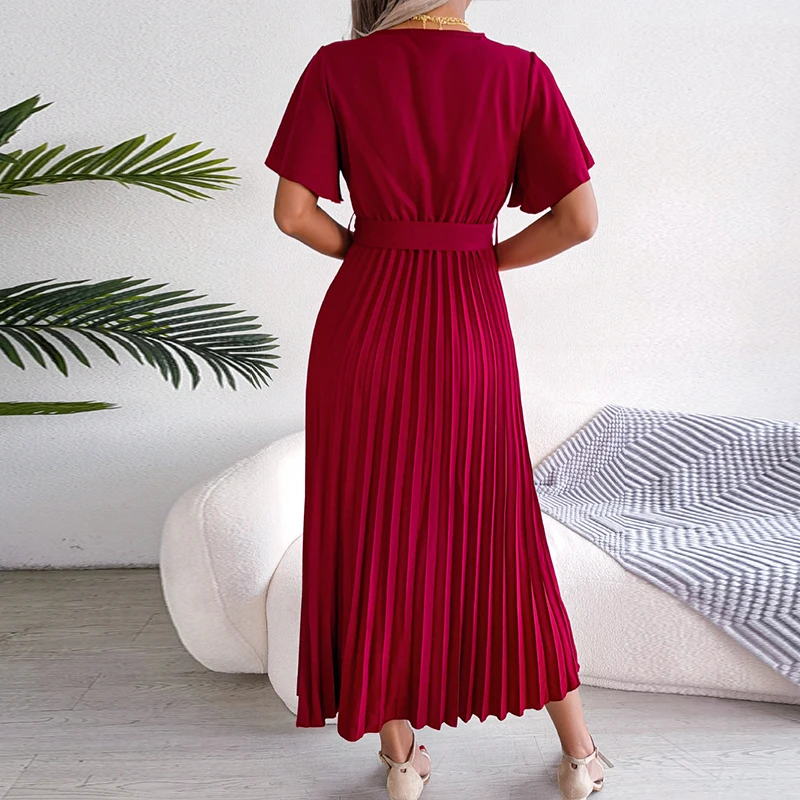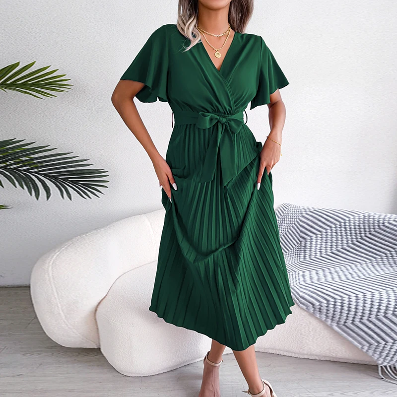 vmtvr Fashion Ladies V-neck Short Sleeved Commuting Dress Spring Summer Loose Lace Up Pleats Dress Casual Party Long Dresses Vestidos
