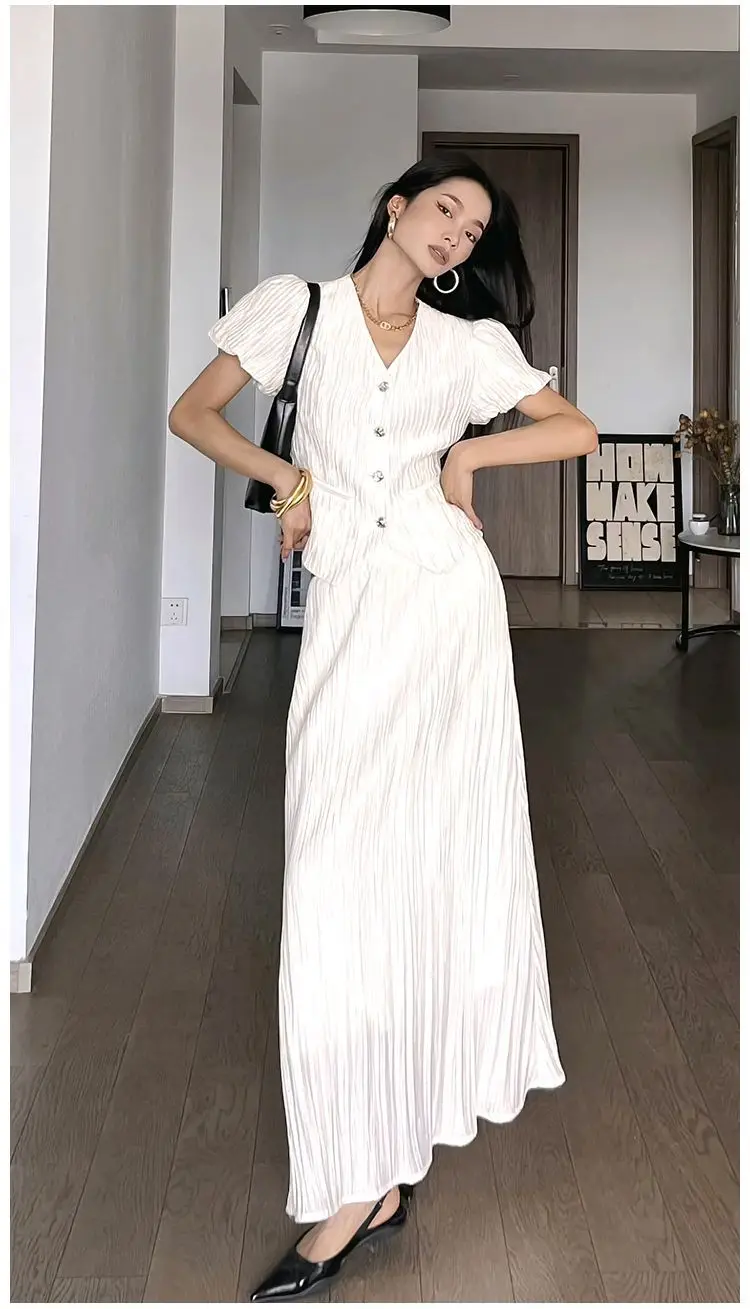 vmtvr French Gentle V-neck High-end and Sweet Set for Women's Summer New Waist Slimming Skirt Fashion 2-piece Set