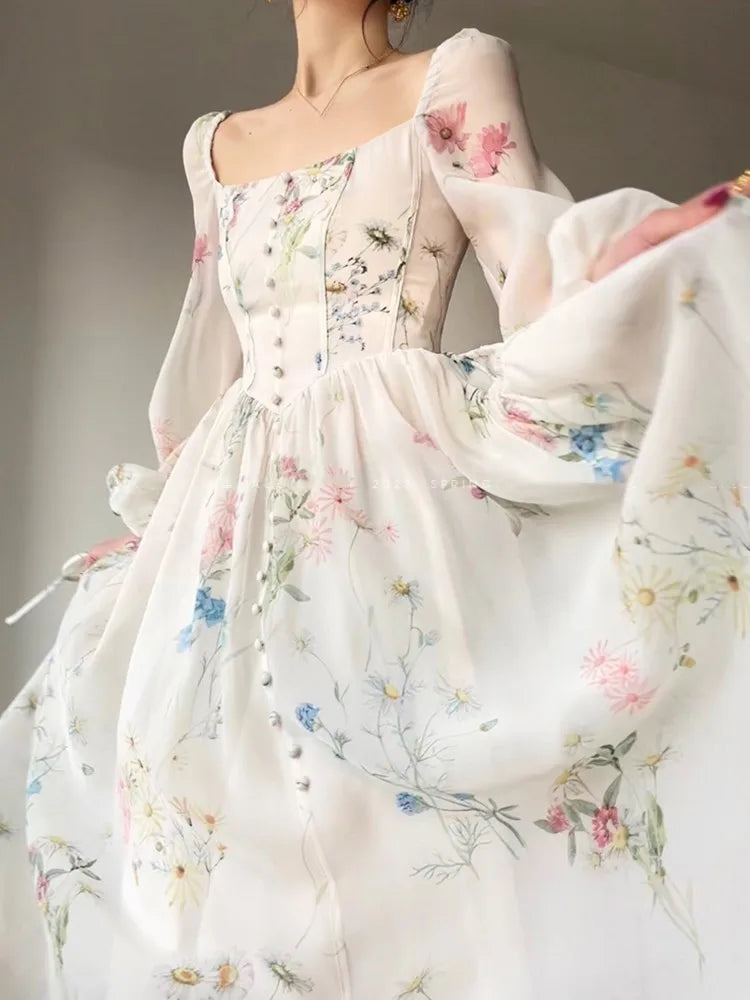 vmtvr French Vinatge Floral Long Dresses for Women Evening Party A-line Beach Dress Lantern Sleeve Spring Summer Prom Robe Vestidos