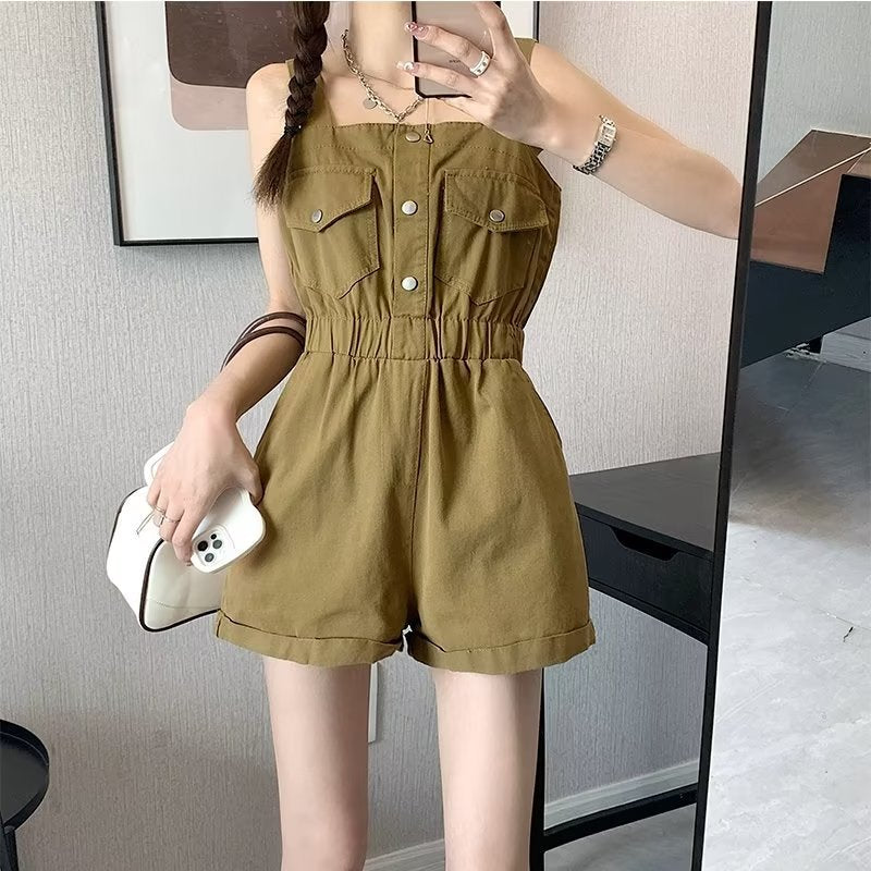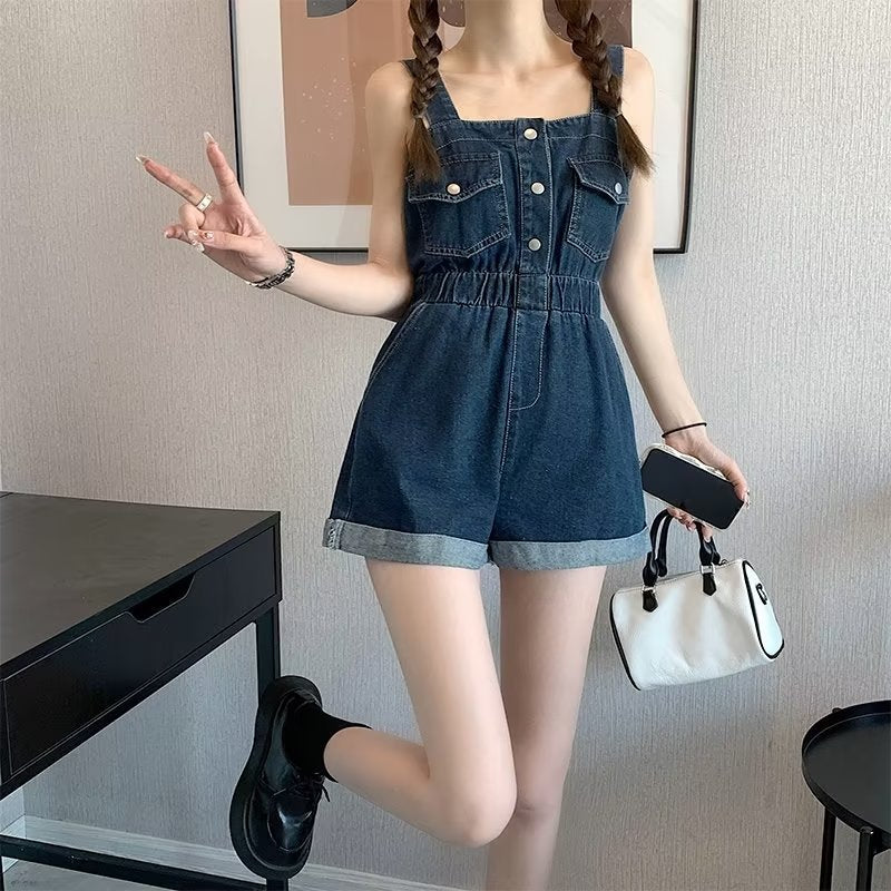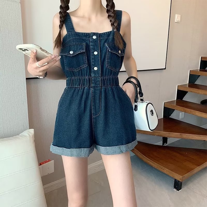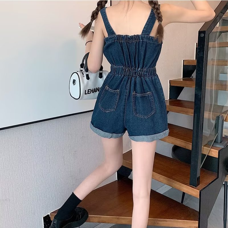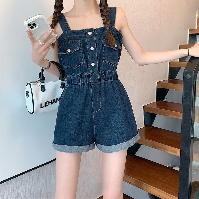 going out outfits 2024 Summer New Workwear Suspender Jeans Women's Small Tight Waist Fashion Wide Leg Curling One-Piece Shorts