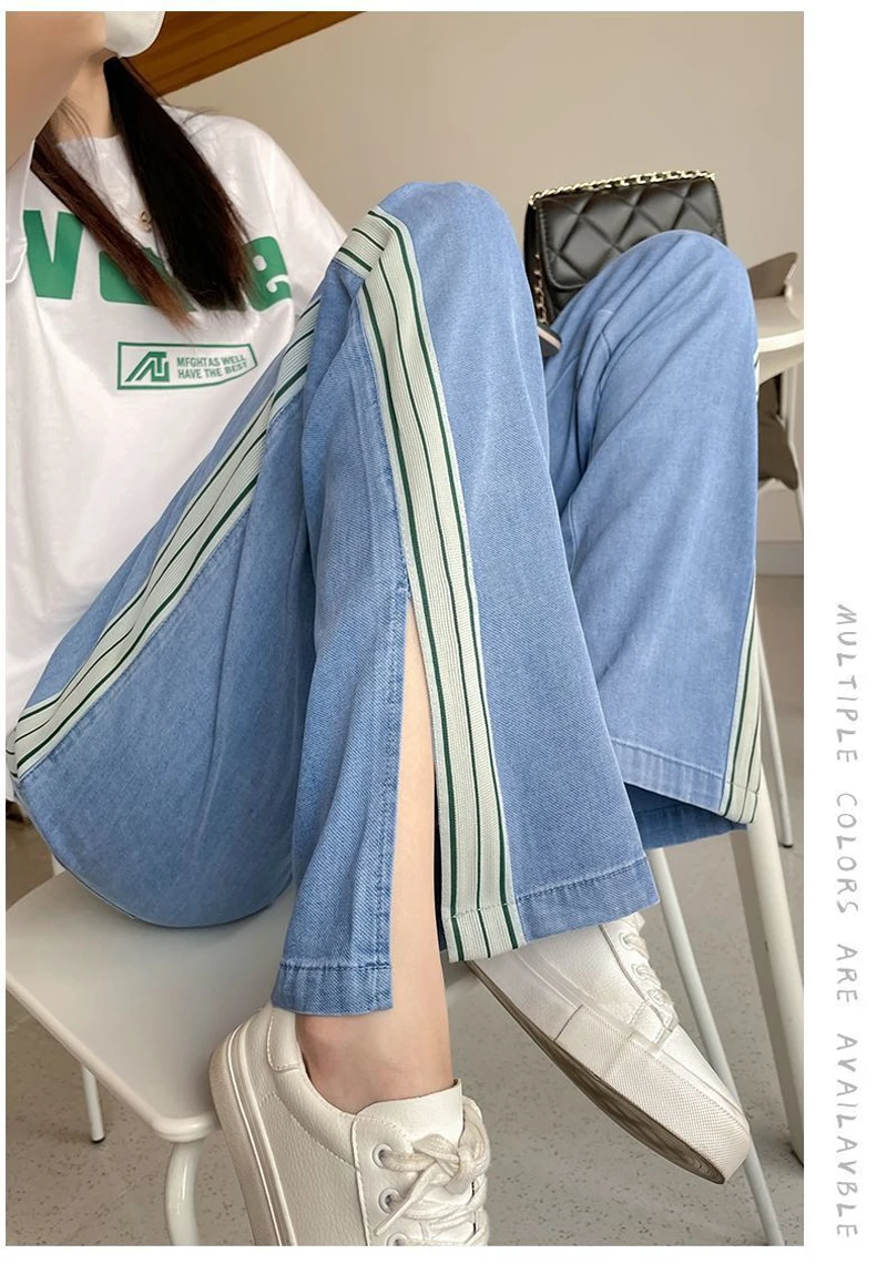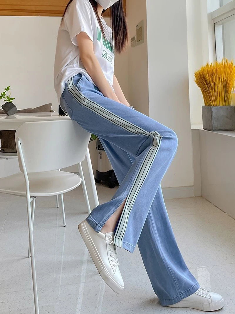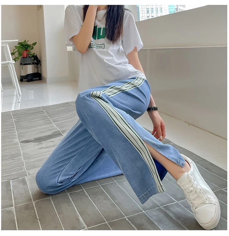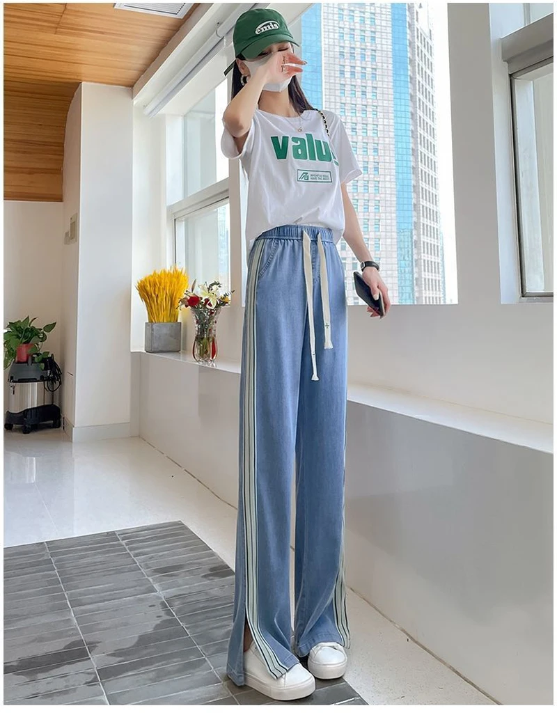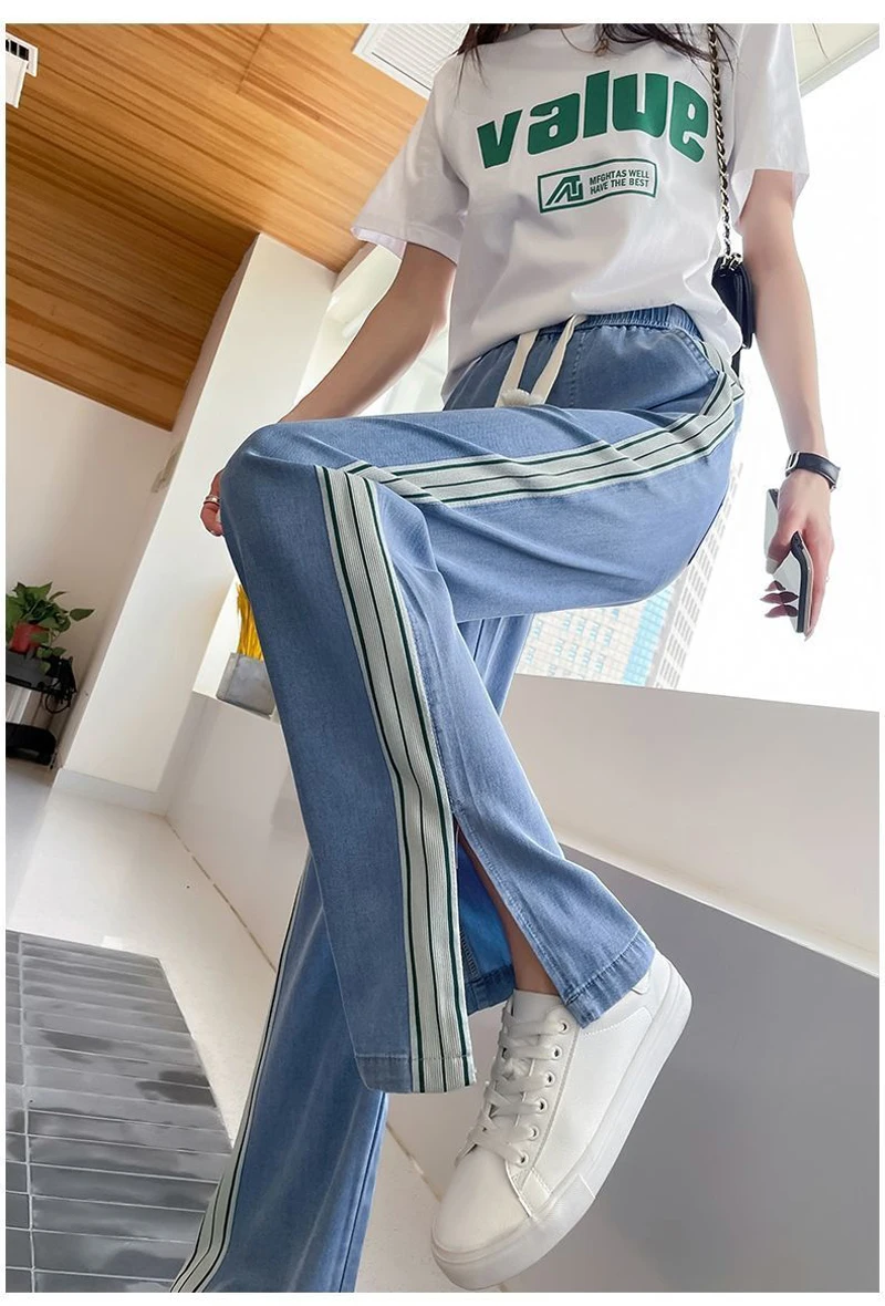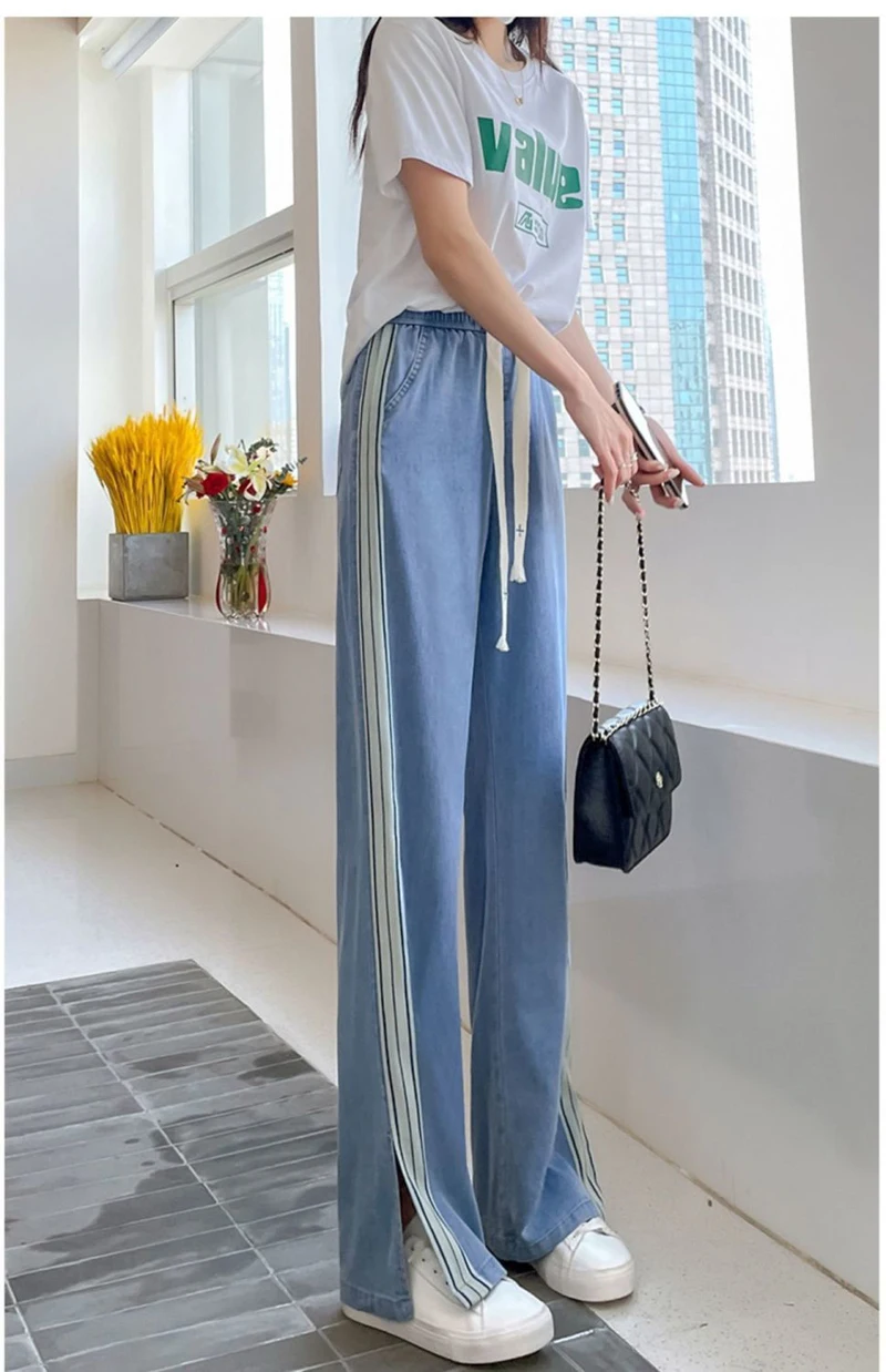 vmtvr Harajuku Striped Slit Wide Leg Denim Pants Women Summer Thin High Waist Baggy Jeans Fashion Lace Up Female Casual Trousers