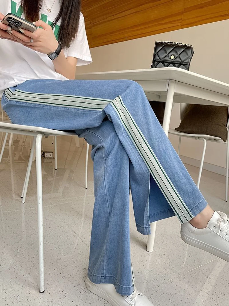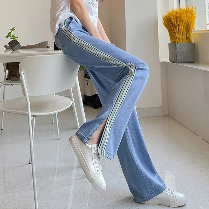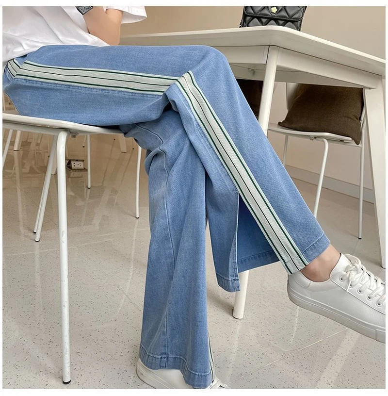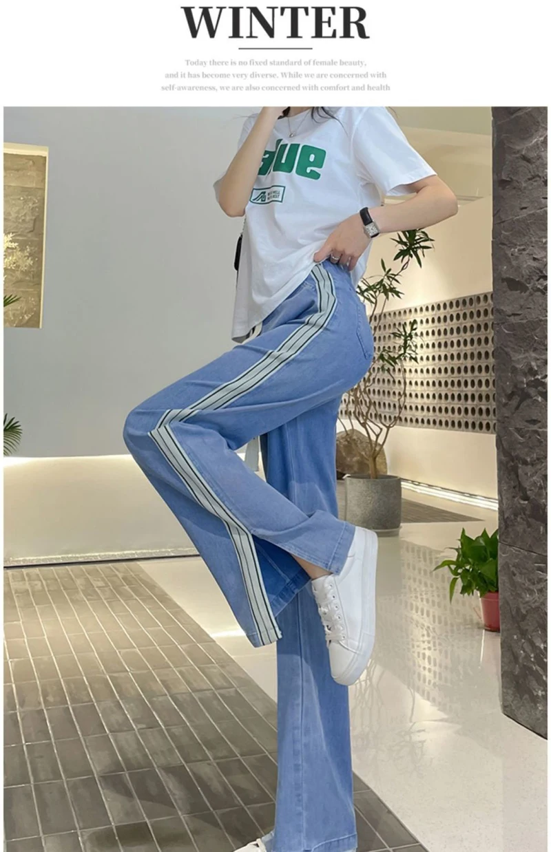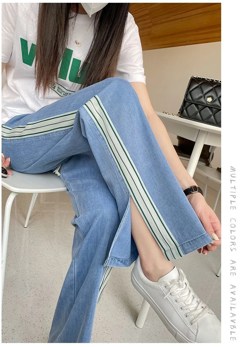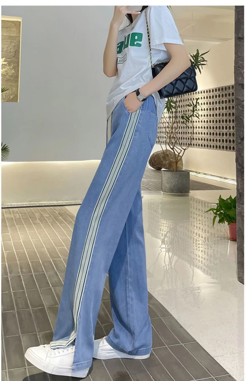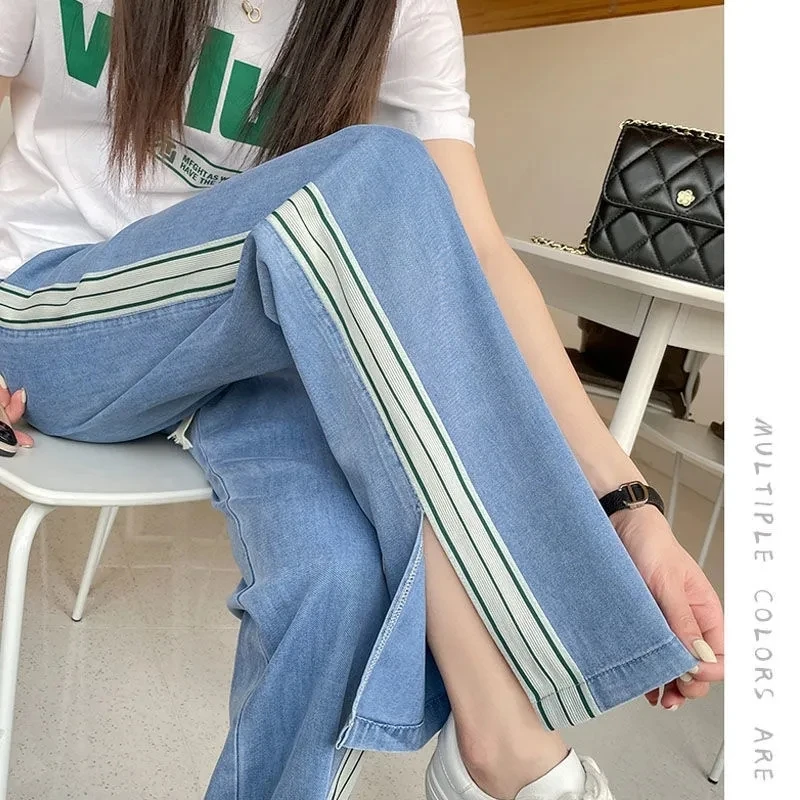vmtvr Harajuku Striped Slit Wide Leg Denim Pants Women Summer Thin High Waist Baggy Jeans Fashion Lace Up Female Casual Trousers