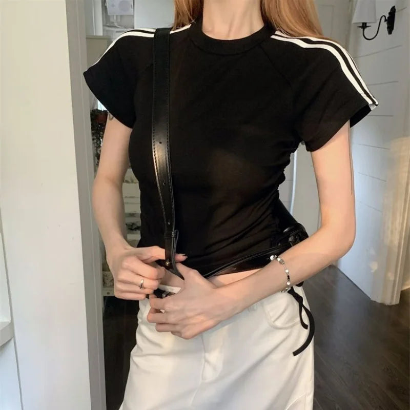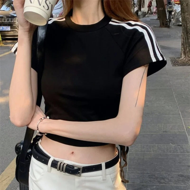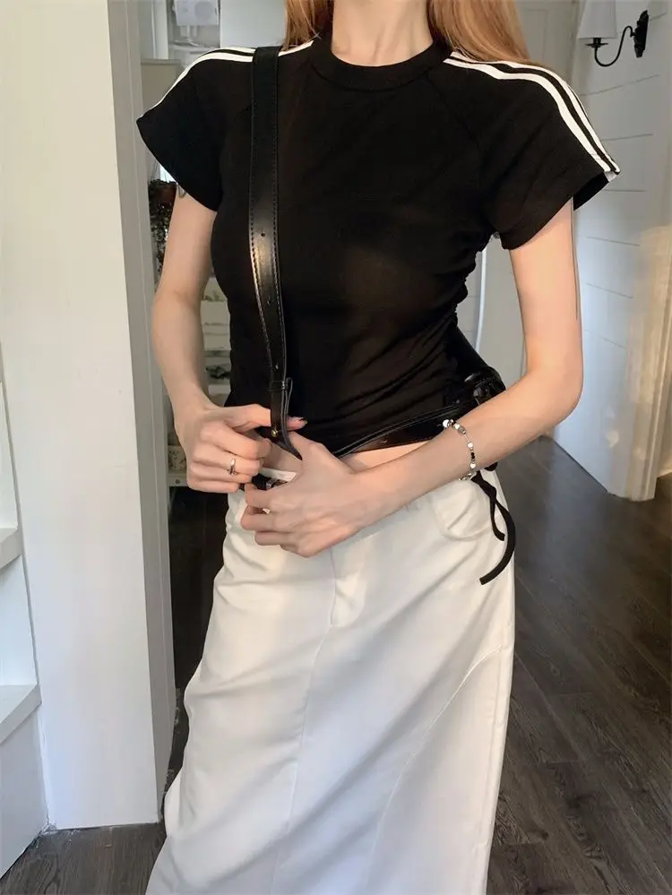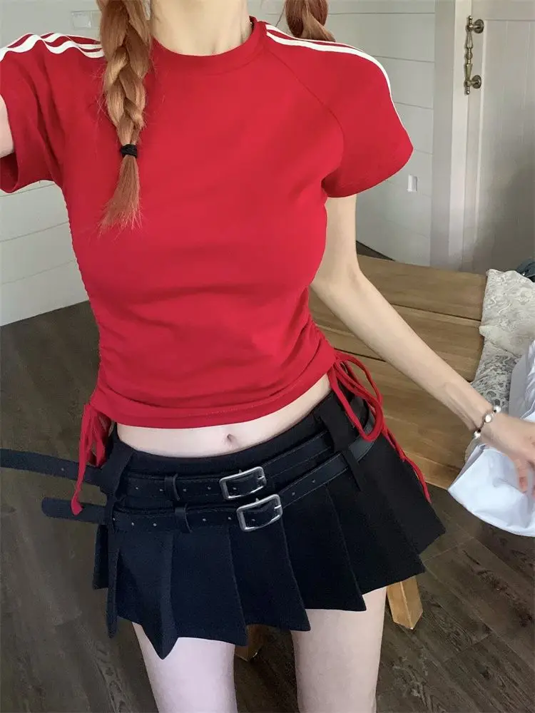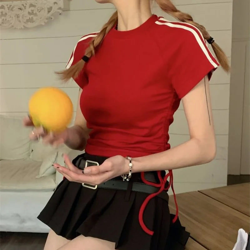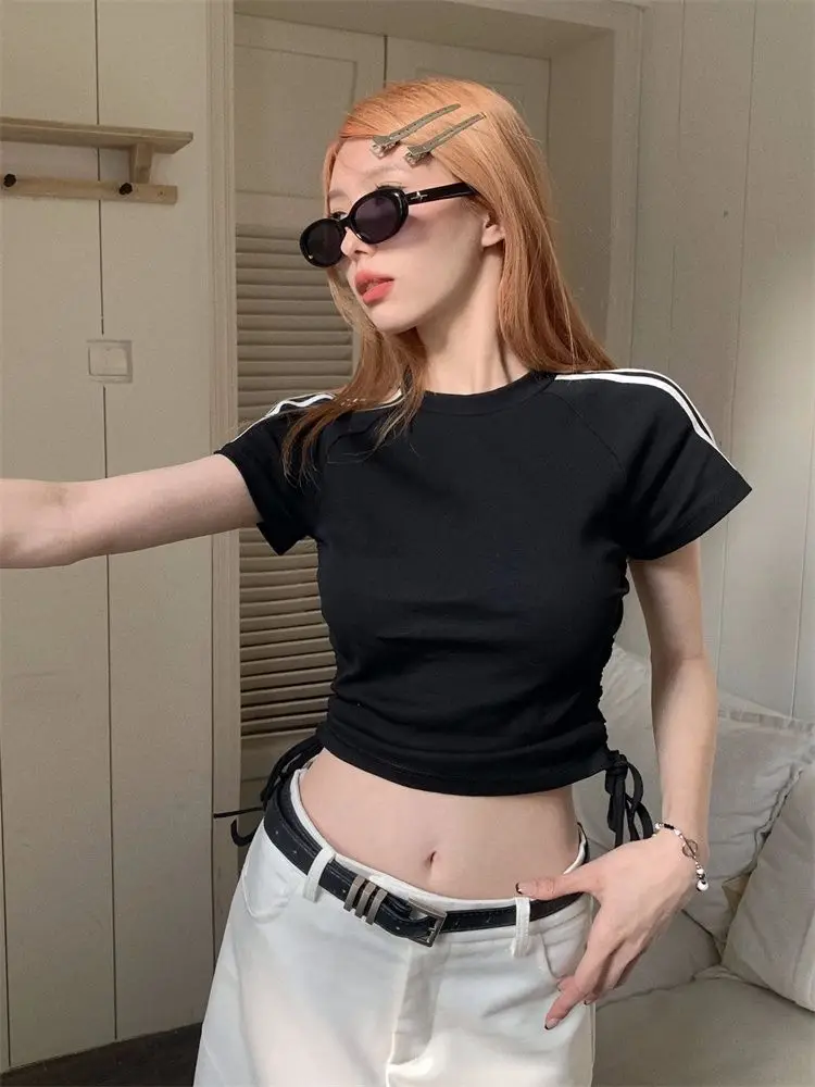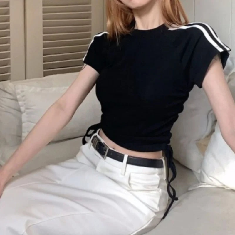 vmtvr Harajuku Summer Women Striped Short T-shirt Streetwear Fashion New Korean Clothing Drawstring Slim Basic Short Sleeve Crop Tops