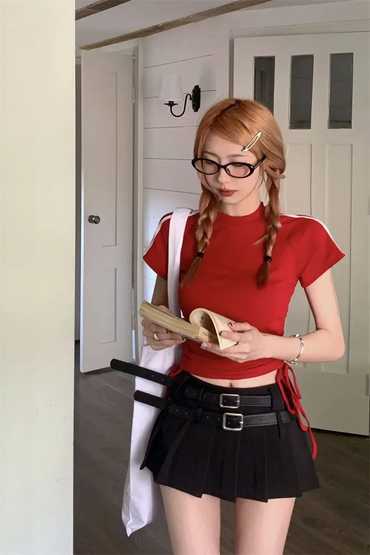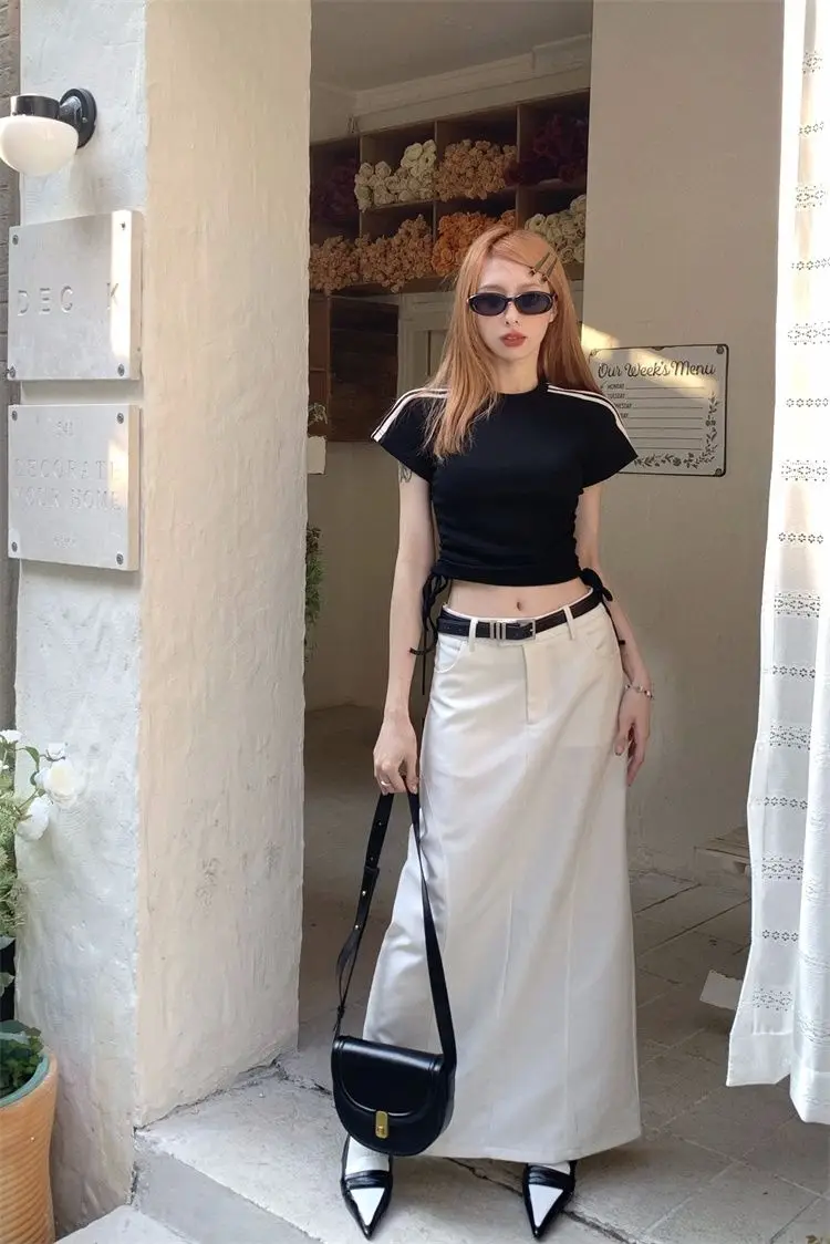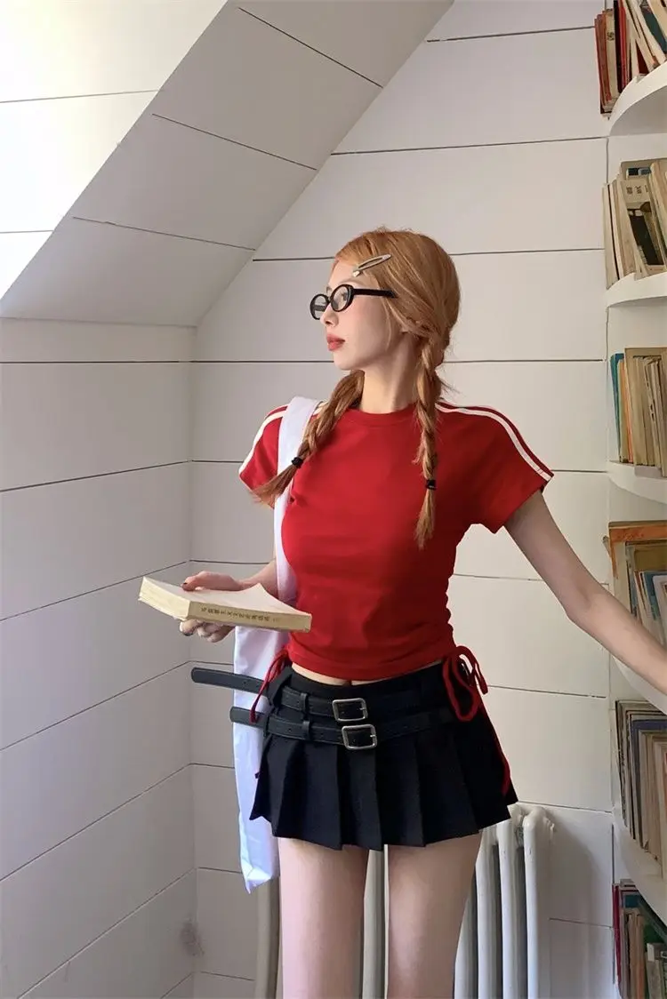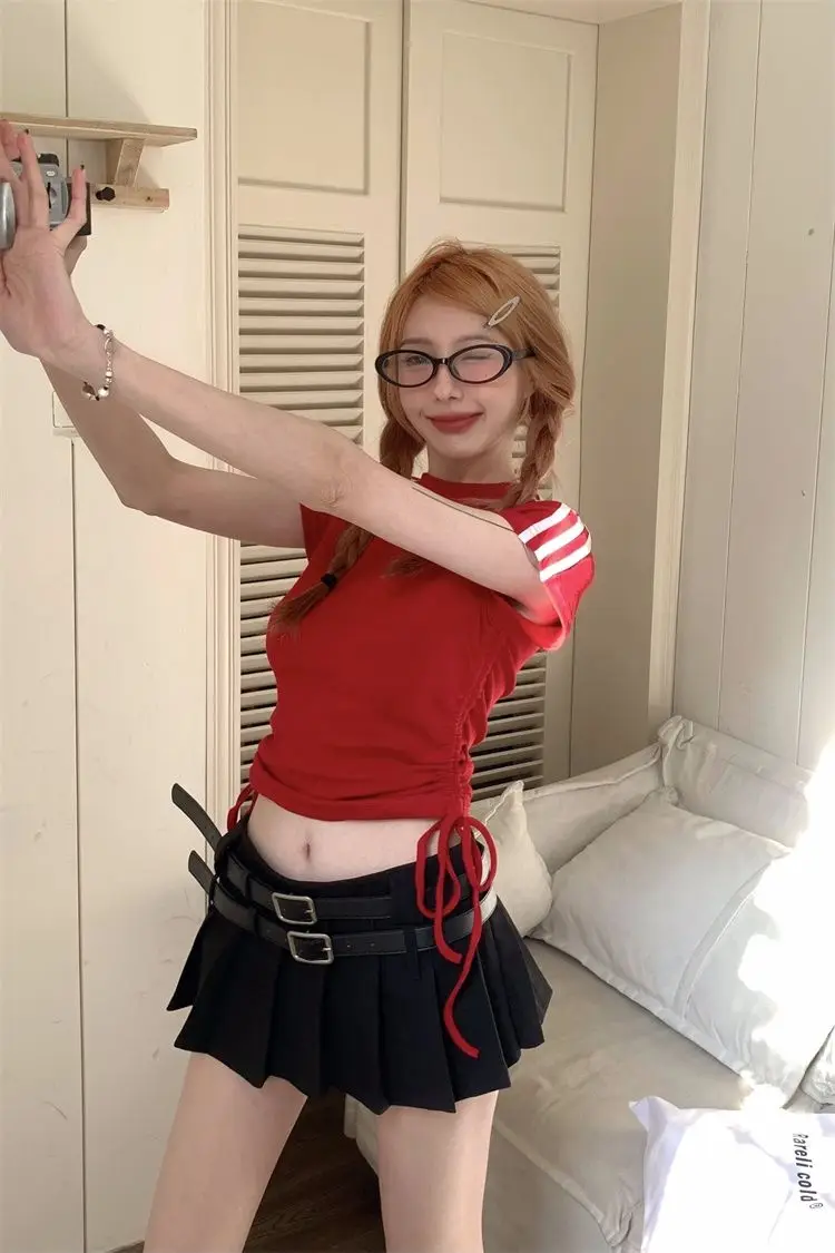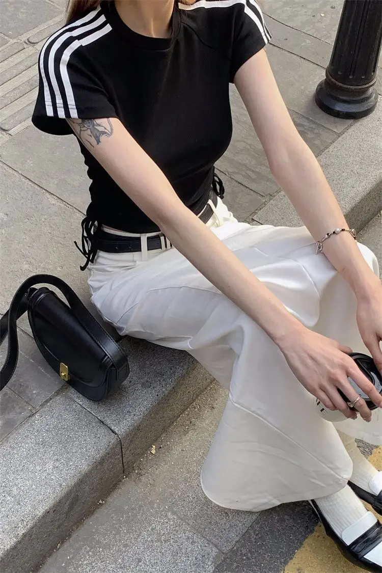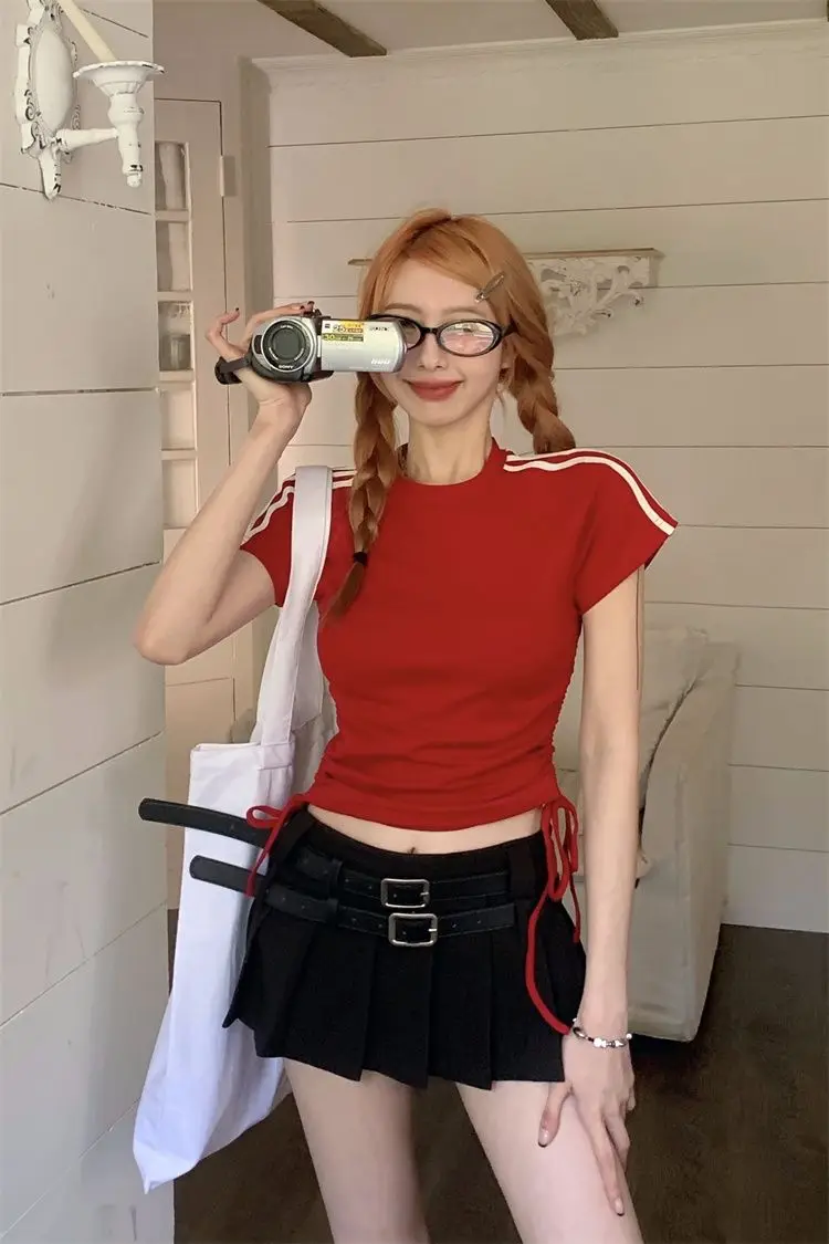 vmtvr Harajuku Summer Women Striped Short T-shirt Streetwear Fashion New Korean Clothing Drawstring Slim Basic Short Sleeve Crop Tops