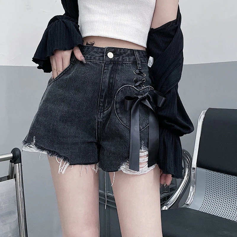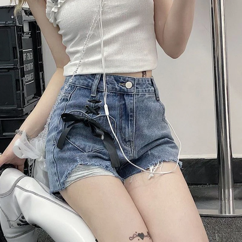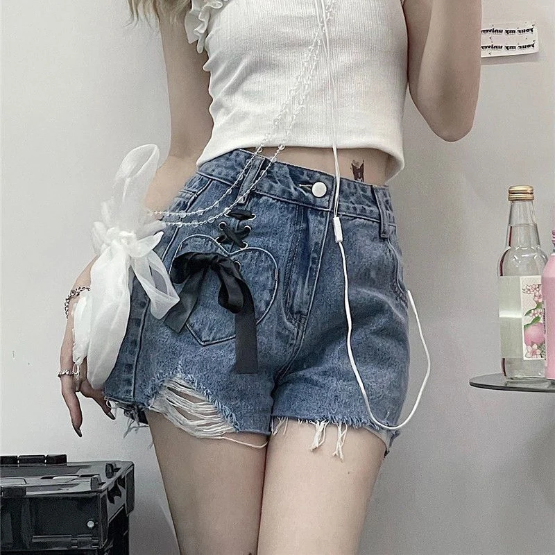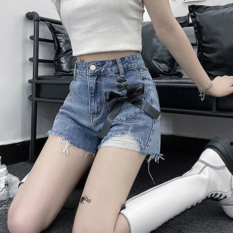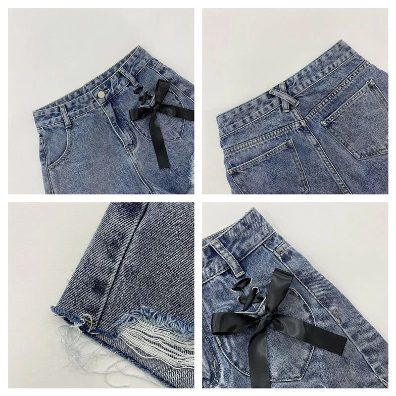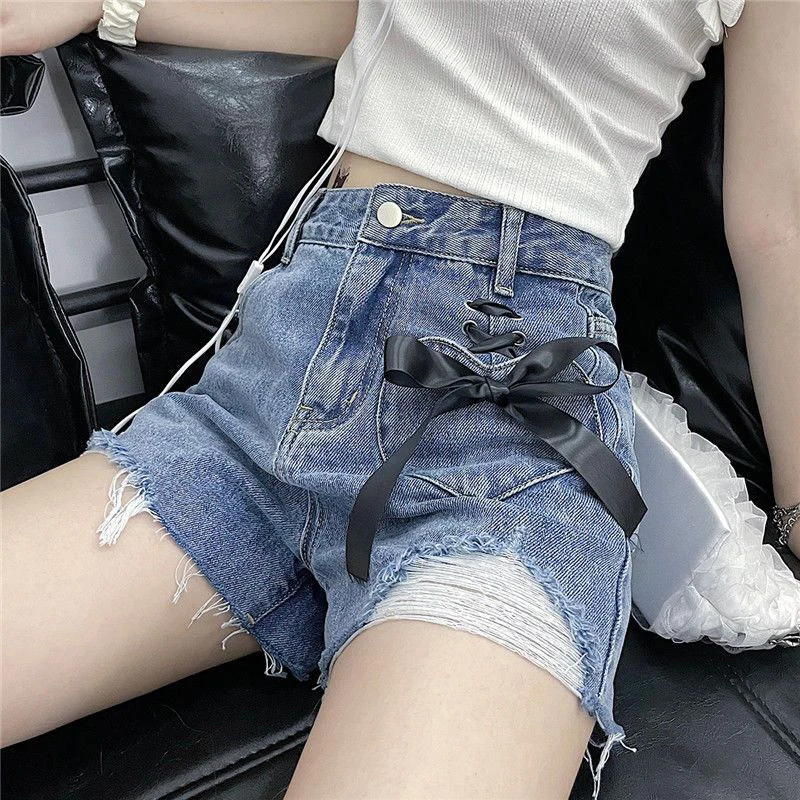 vmtvr High Waist Women Denim Shorts Summer Fashion Bow Loose Shorts Korean Casual Female Streetwear All Match Ripped Pants