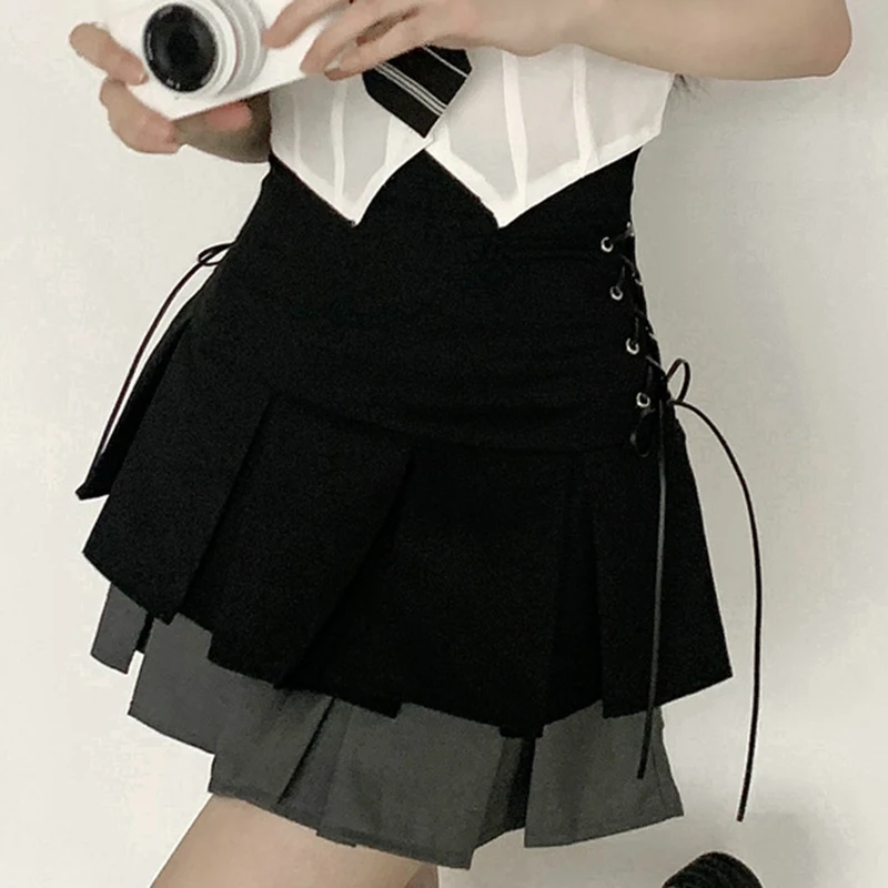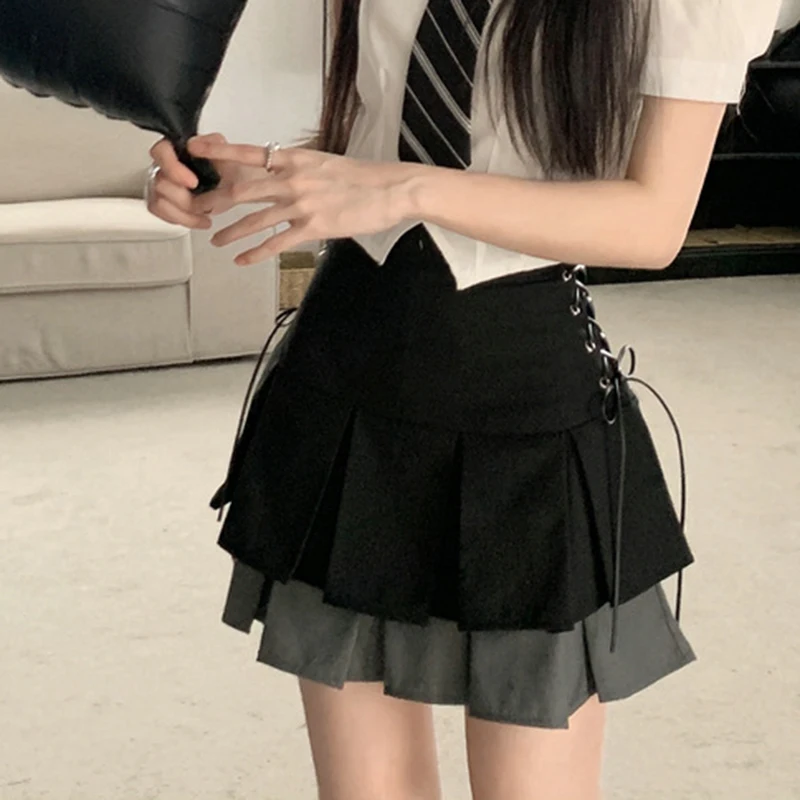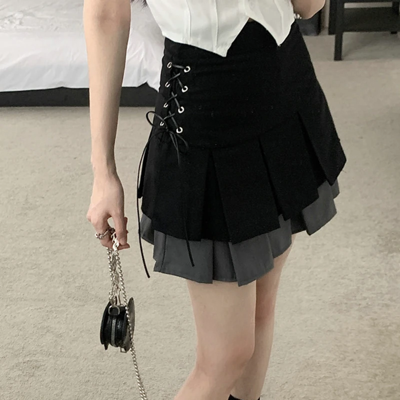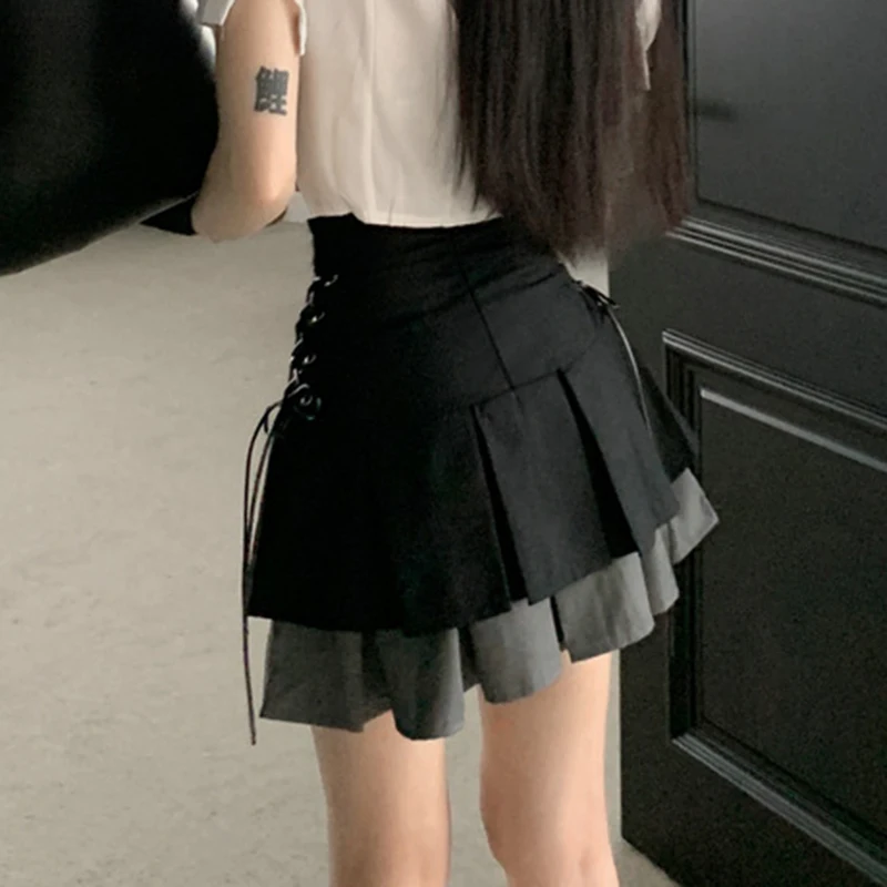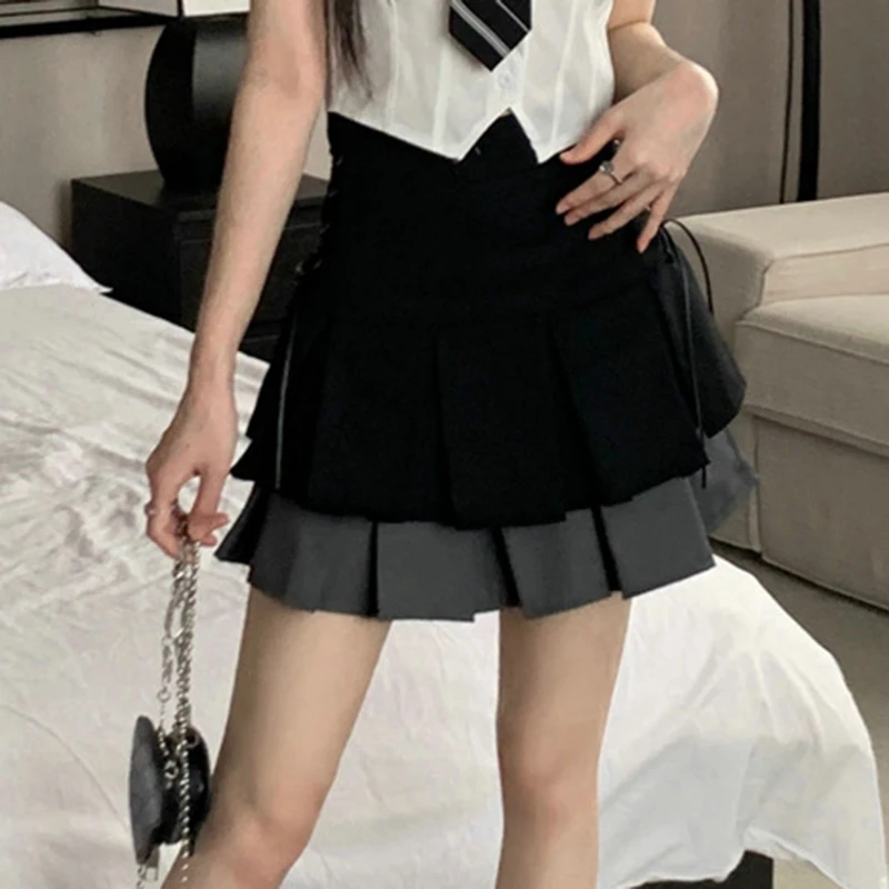 vmtvr High Waist Women Patchwork Skirts Summer Fashion Lace Up Female Mini Skirts Korean Elegant Pleated A Line Skirts New
