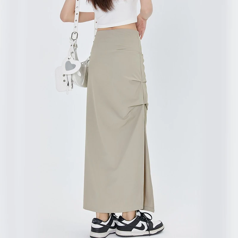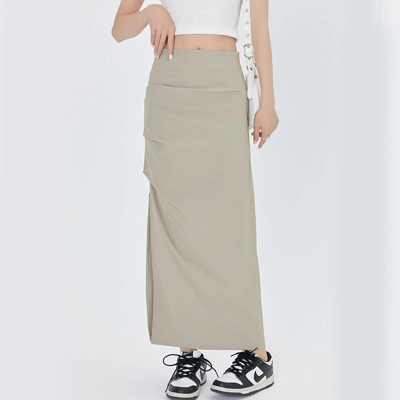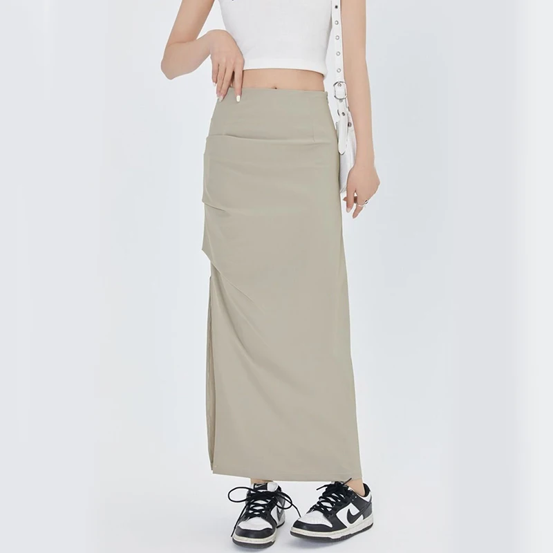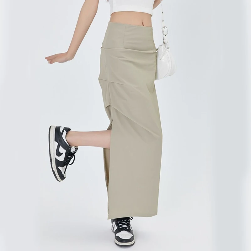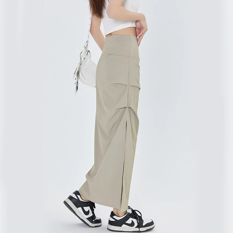 vmtvr High Waist Women Skirts Summer American Style Elegant Folds Ankle Length Skirts Female Casual All Match Split Skirts New