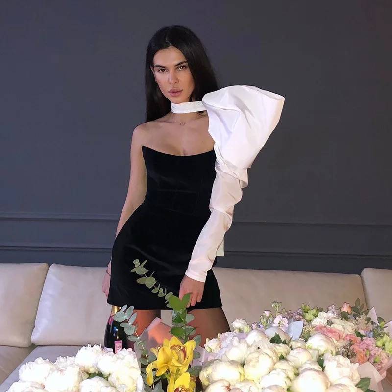 vmtvr Irregular Cow Horn Sleeves Bra Dress Spring And Summer Women's Special Single Room Bow Fishbone Elastin Slim Fit Evening Dress