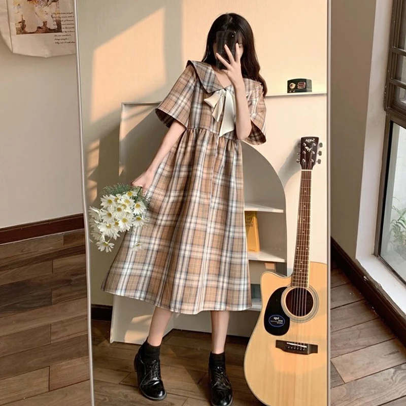 vmtvr Japan Sweet Sailor Collar Plaid Dress Women Fashion Preppy Style Cute Bow Short Sleeve Midi Dress Summer Lace Up Vestidos