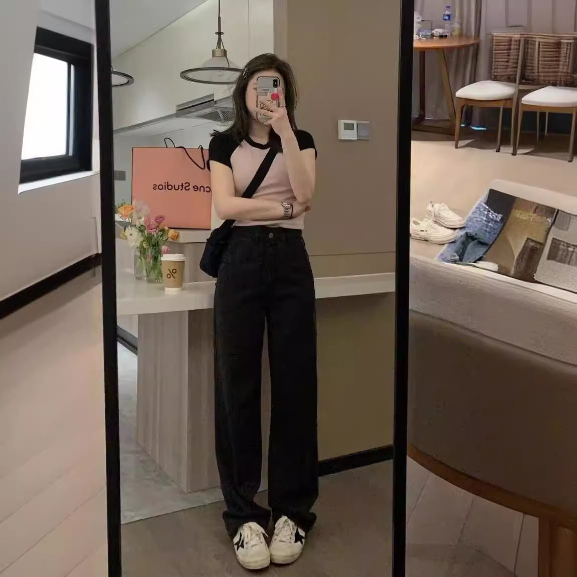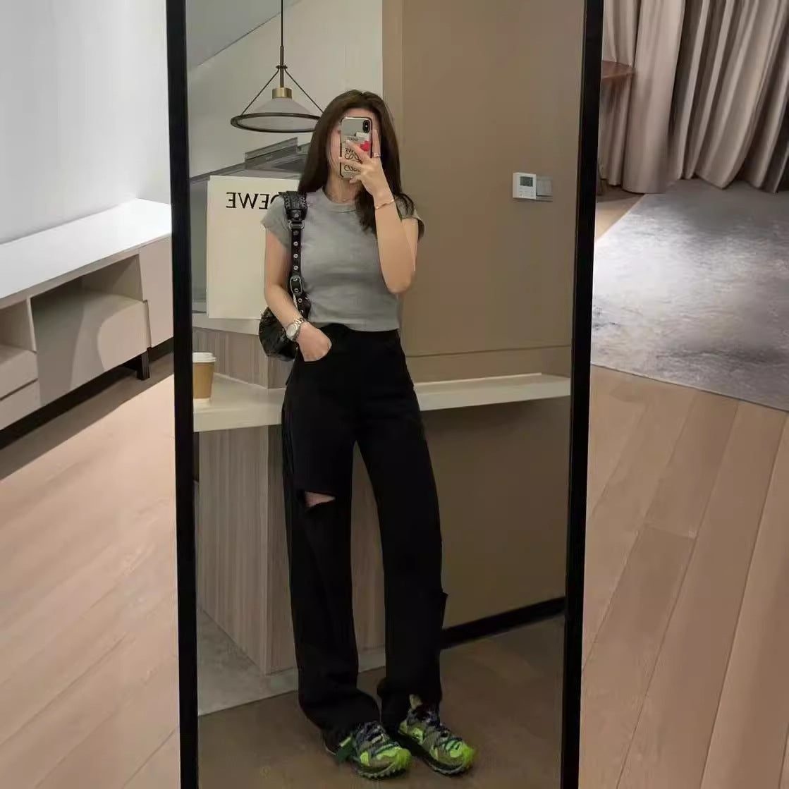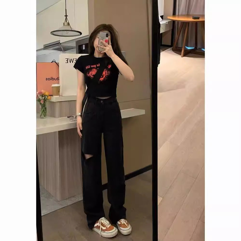 vmtvr joker costume female outfit Black Straight Ripped Jeans Women's High Waist Summer Loose Slimming Pear-Shaped Wide-Leg Pants