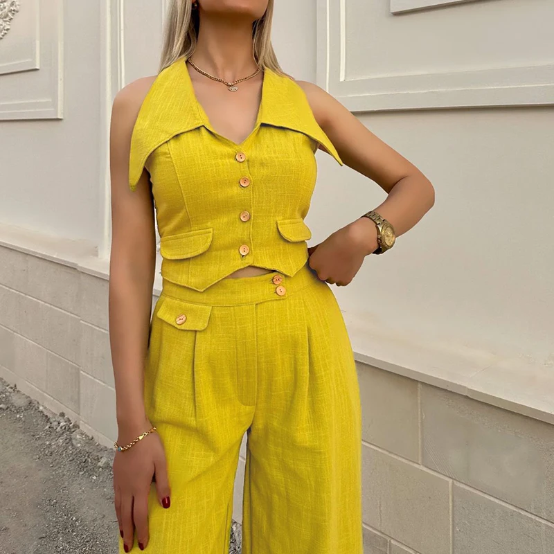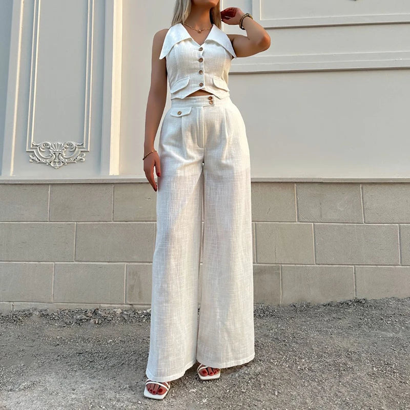 vmtvr Ladies Turn-down Collar Button Top and Wide Leg Pants Set Fashion Elegant Commuting Slim Suit New Summer Streetwear Solid Outfit