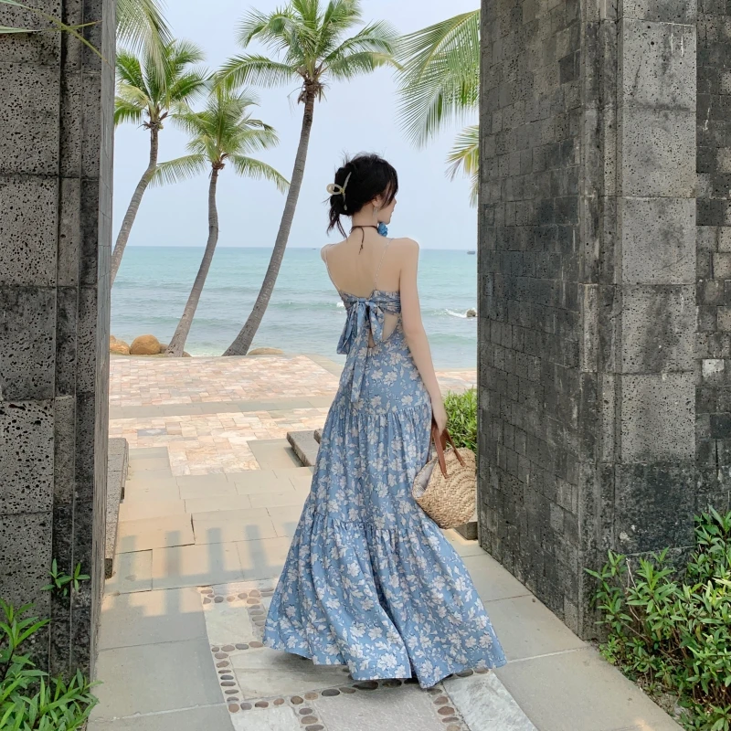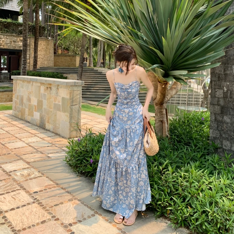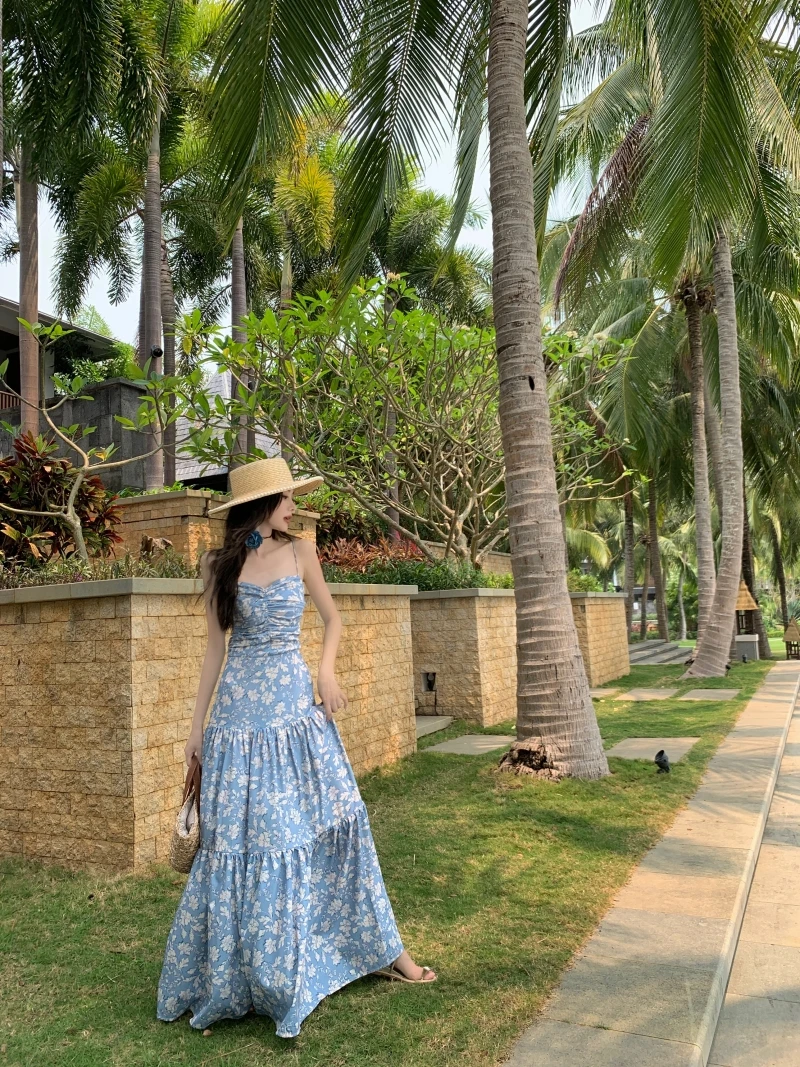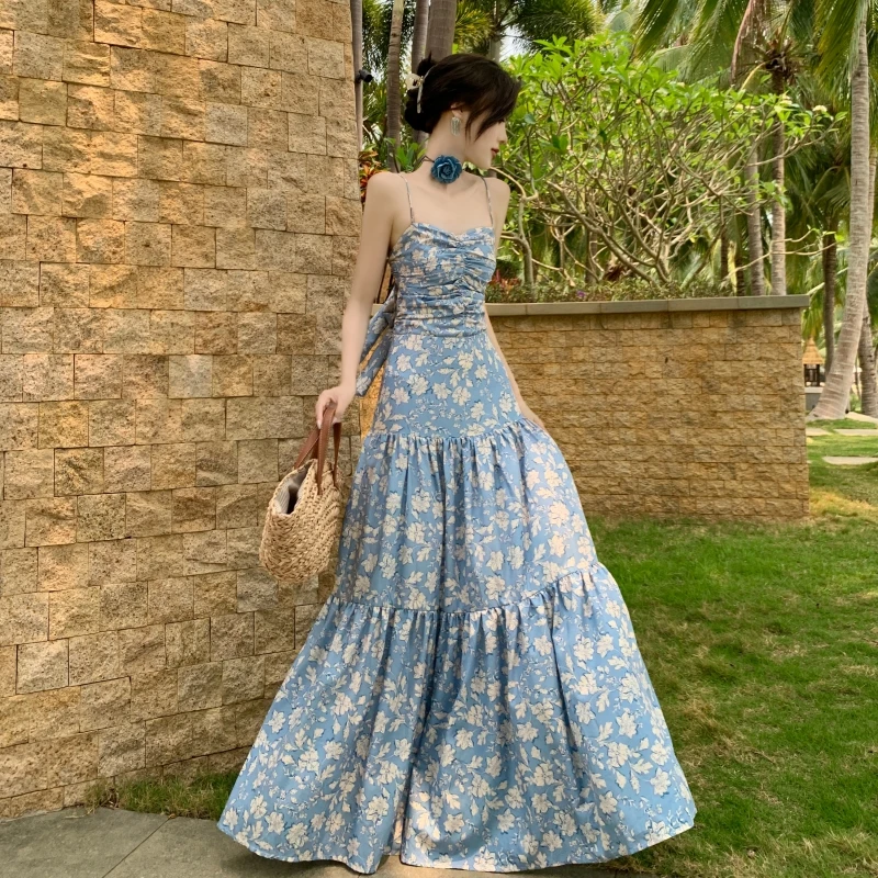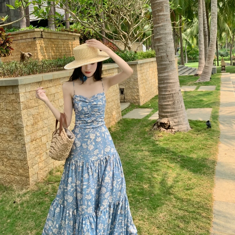 vmtvr New Summer Long Print Dress for Women Strap Sleeveless Sweet Elastick Holiday Beach Casual Dresses Female Clothing