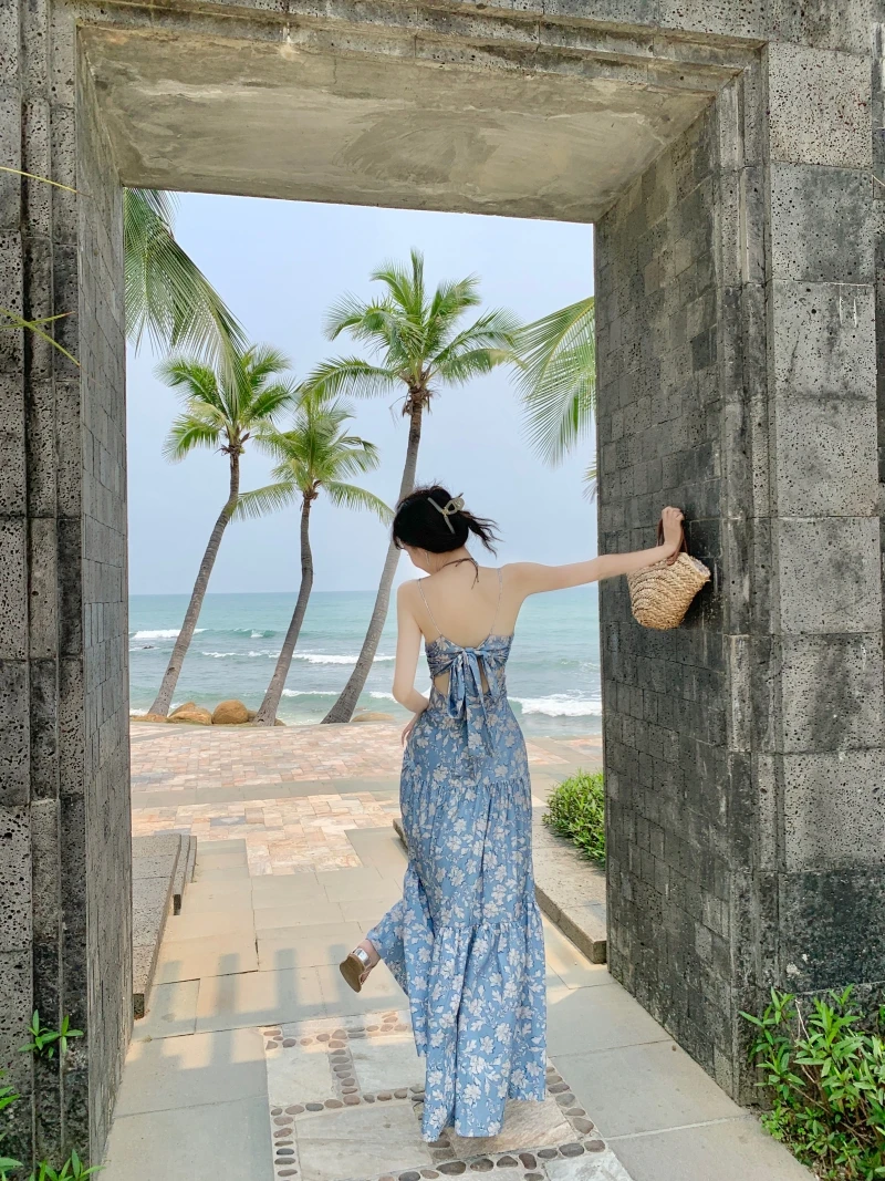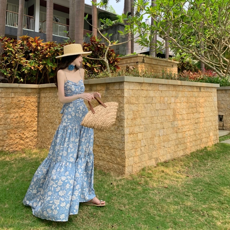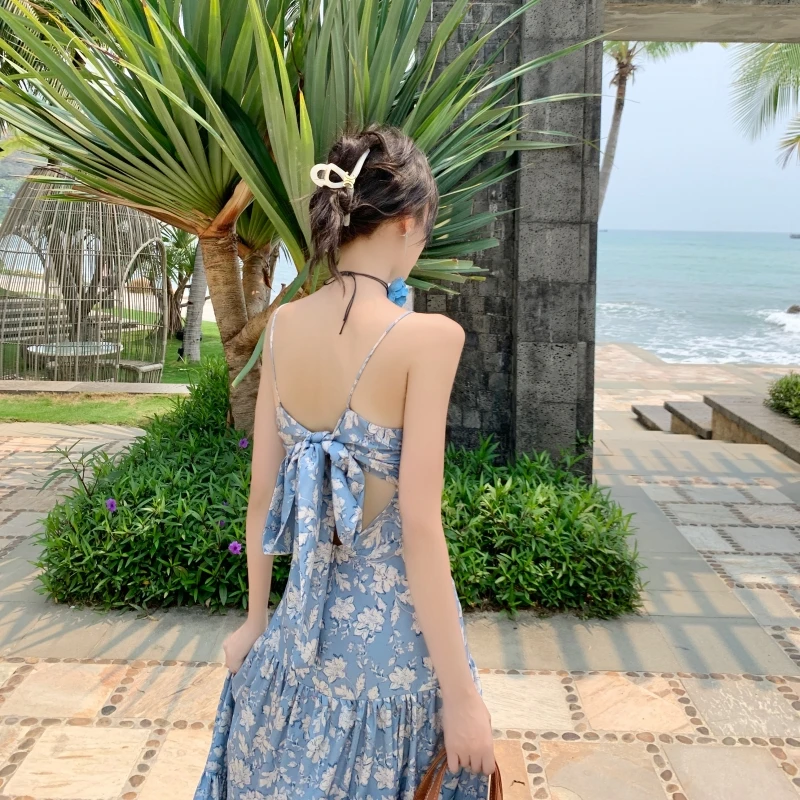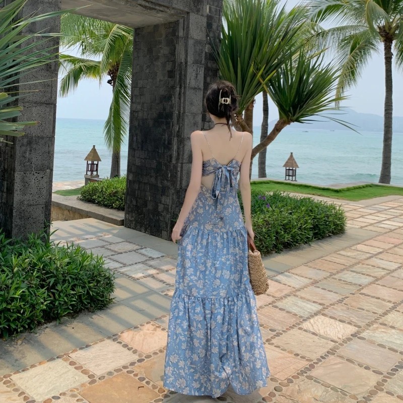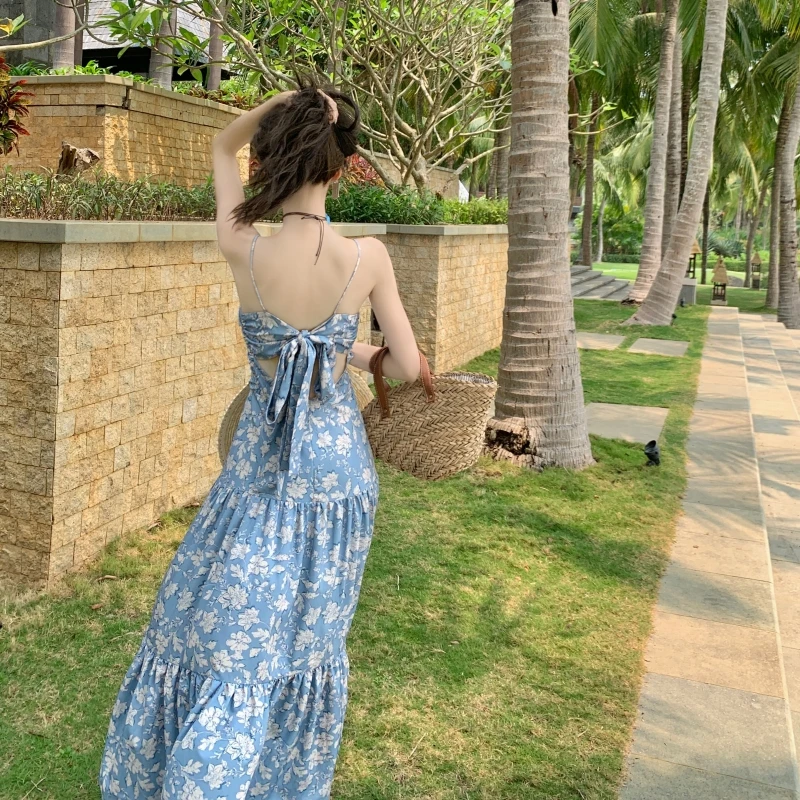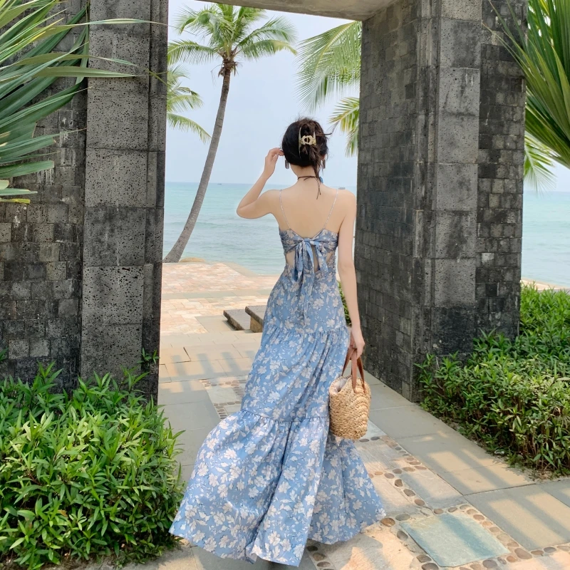 vmtvr New Summer Long Print Dress for Women Strap Sleeveless Sweet Elastick Holiday Beach Casual Dresses Female Clothing