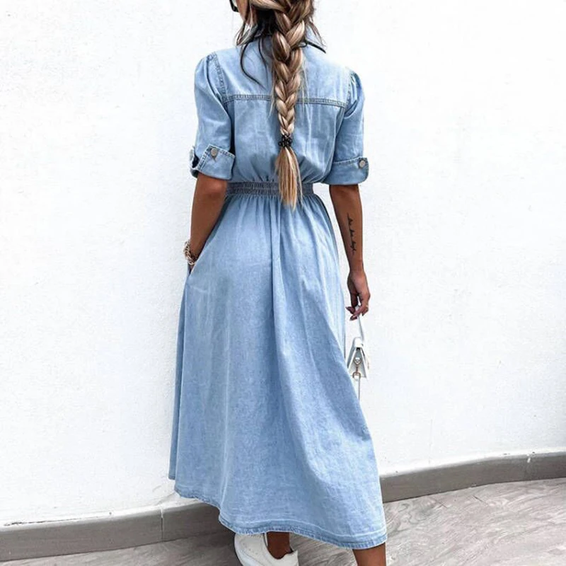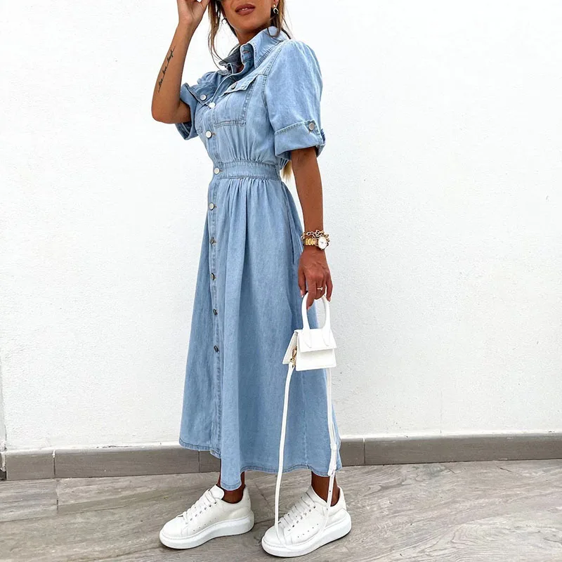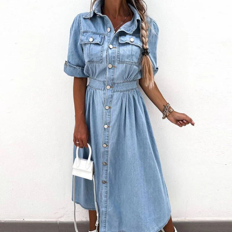 vmtvr New Turn-down Collar Short Sleeve Summer Dress Women's Single Breasted Pocket Casual Dress Denim High Waist Pleated 2024 Dresses