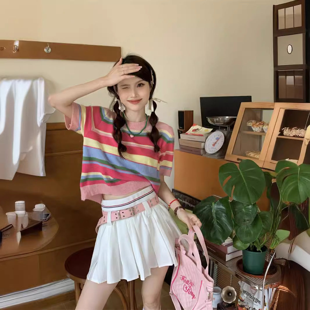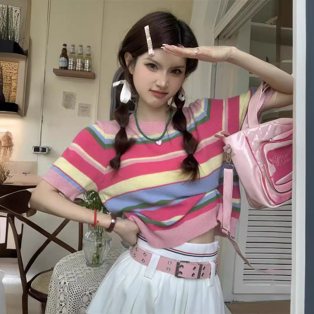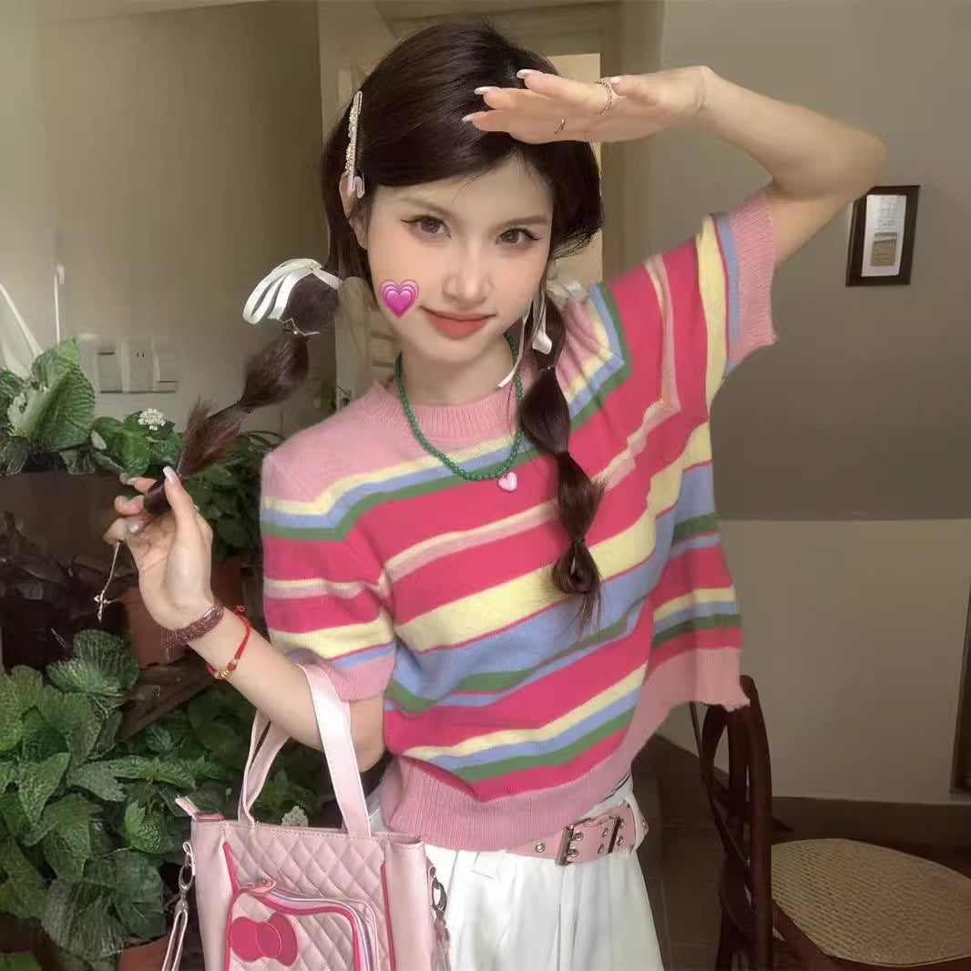 vmtvr outfit inspo Dopamine Hot Girl Korean T-shirt Women's Summer New Color Matching Striped round Neck Pullover Casual Sweet and Spicy Short Sleeve Top