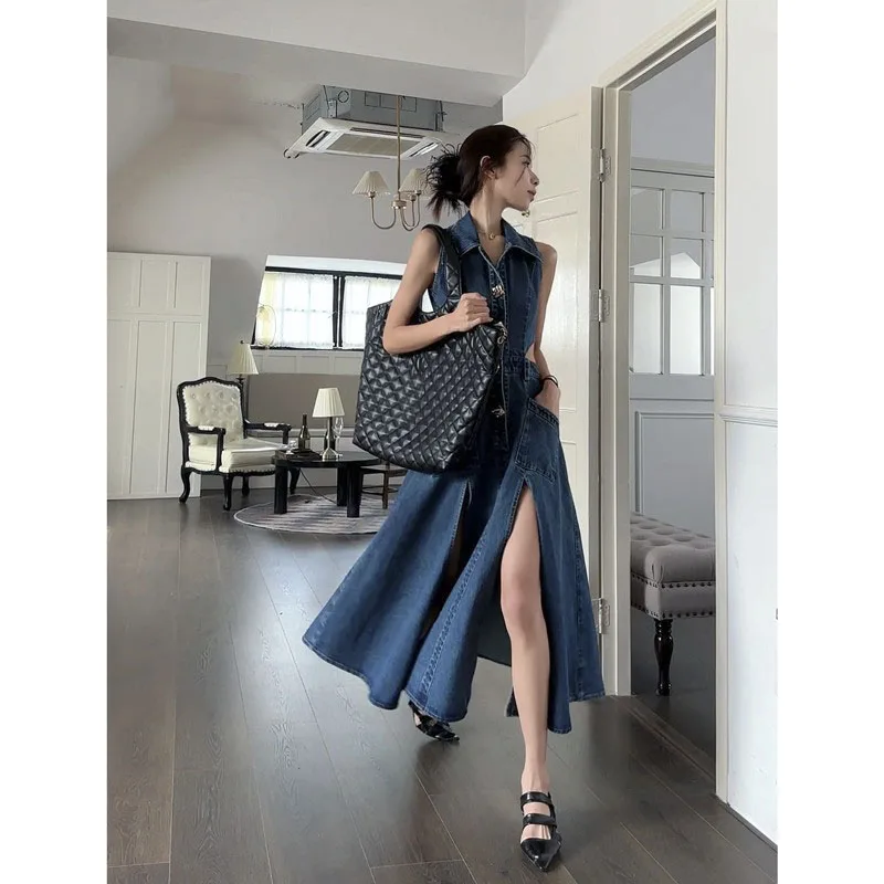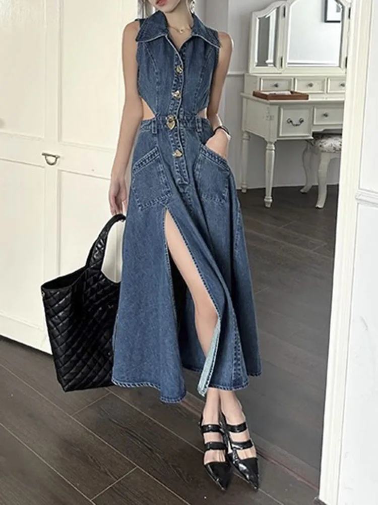 vmtvr Retro Denim Dress Women's Summer New Shirt Collar Hollow Split Waist Long Skirt Sleeveless One-piece Sexy Denim Dresses
