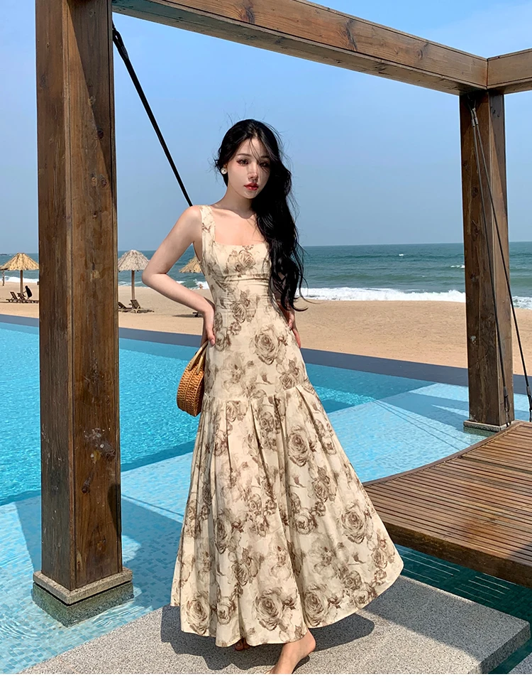 vmtvr Rose Floral Printing Ruffles Slip Long Dresses Bohemian Backless Sleeveless Women Summer Beach Travel Party Wear Ladies Vintage