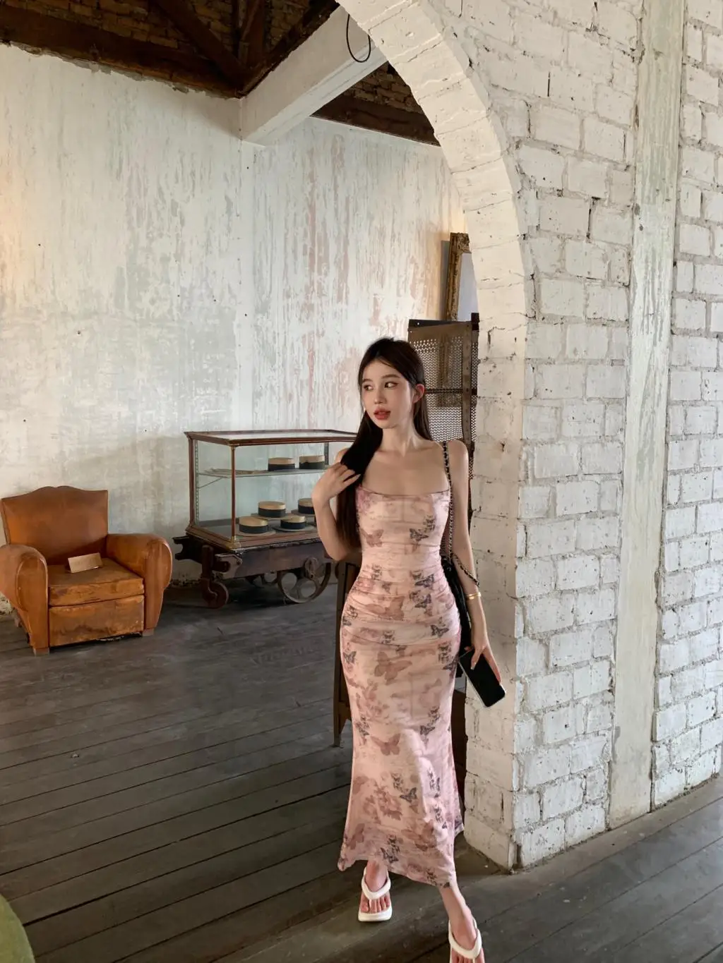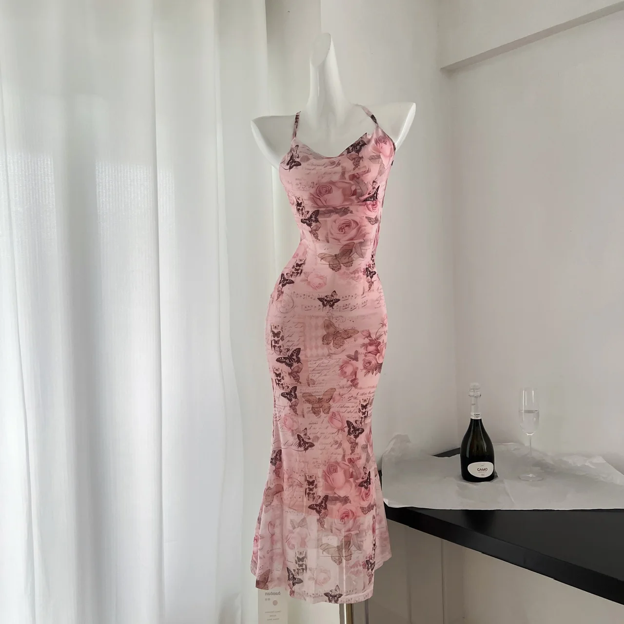 vmtvr Sexy Bodycon Backless Bandage Long Dresses for Women Summer Elegant Printed Spaghetti Strap Lace-up Party Dress Prom Vestidos