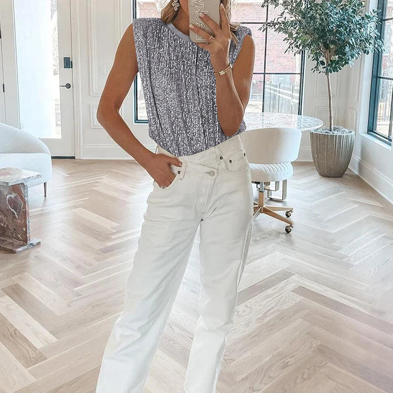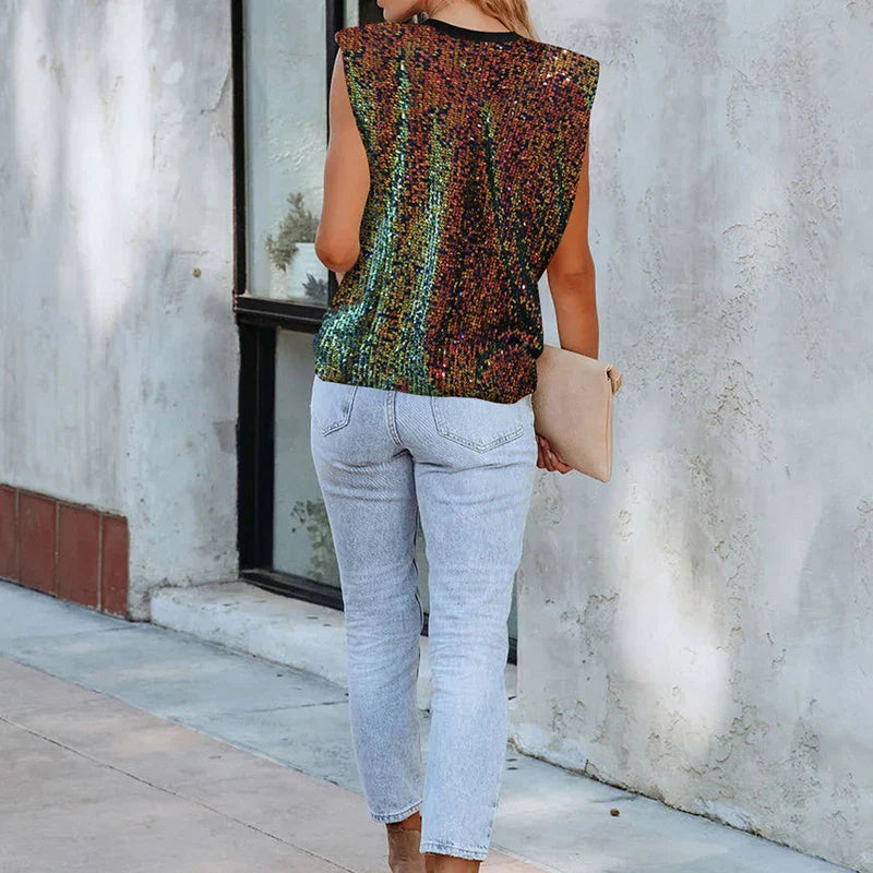 vmtvr Sexy Glitter Sequin Shiny Club Party T-shirt for Women Spring Crew Neck Vest Top Pullover New Summer Sleeveless Hollow Tee Shirt