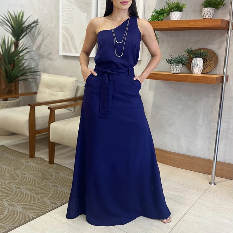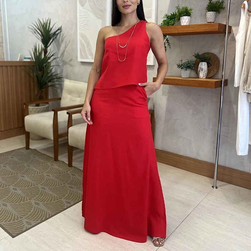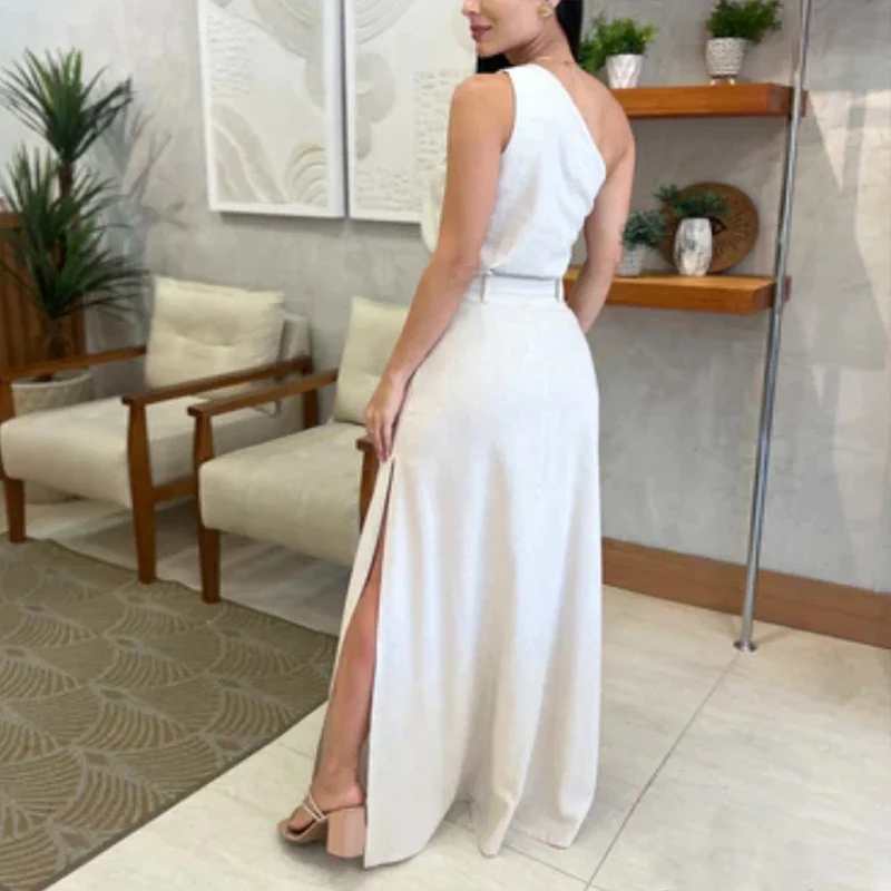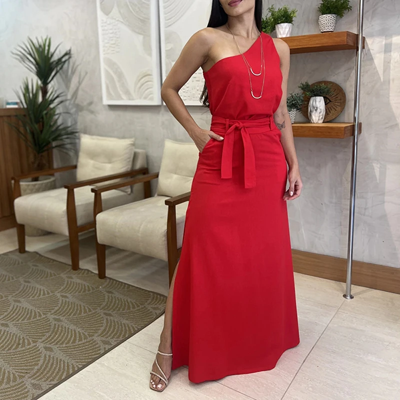 vmtvr Sexy Inclined Shoulder Backless Top & Lace-up Skirts Outfit Women 2024 Spring Solid Cotton Linen Suit Summer Sleeveless Slit Set