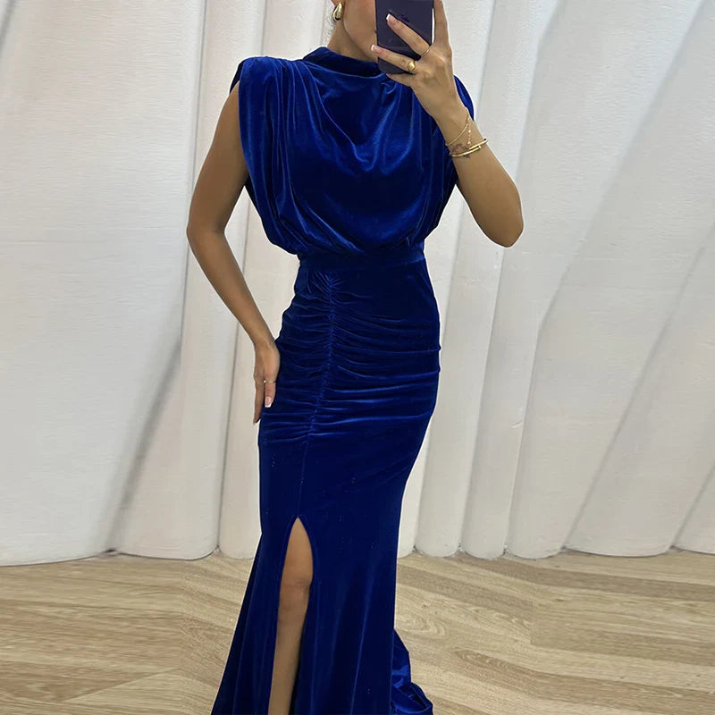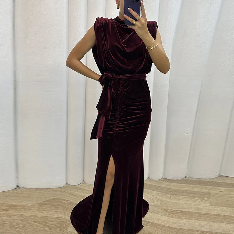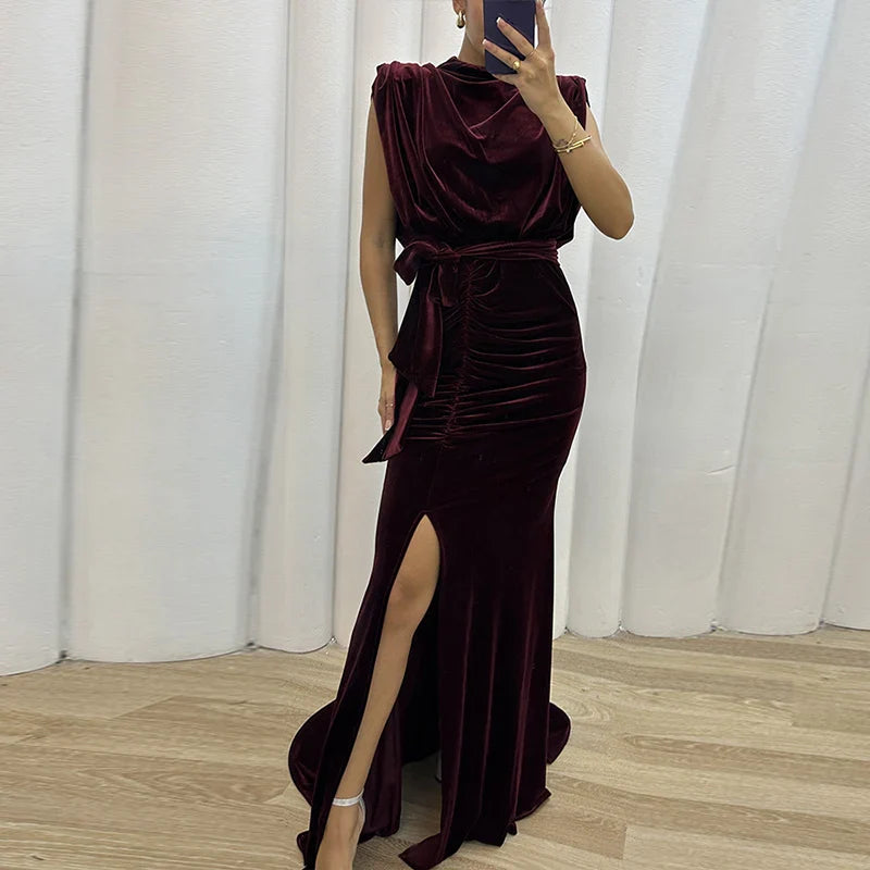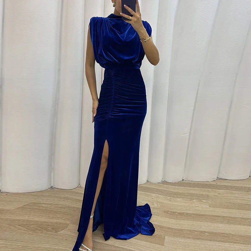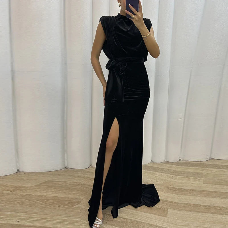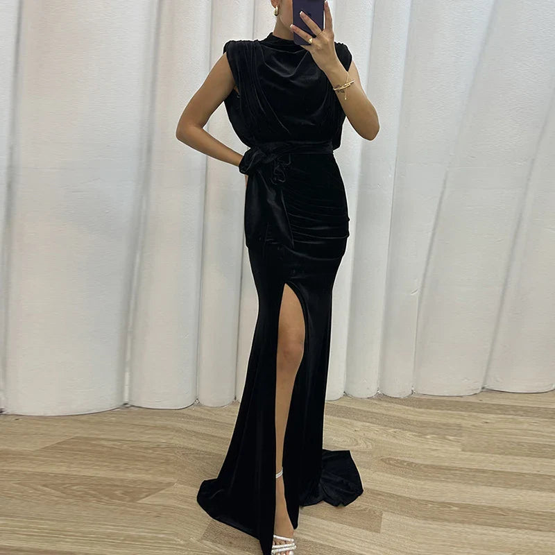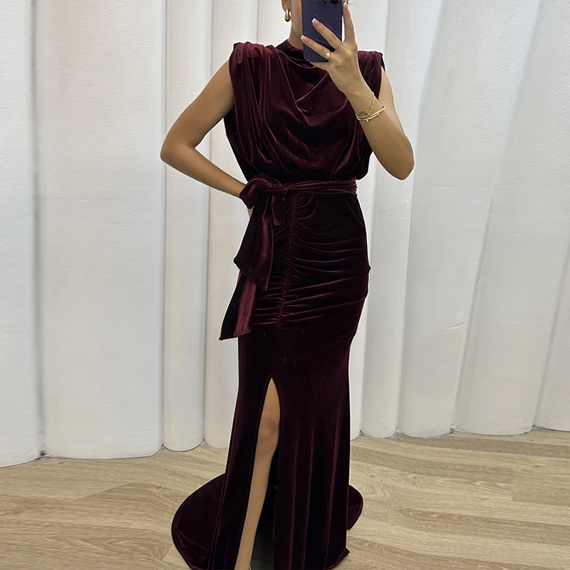 vmtvr Sexy O-neck Sleeveless Soft Velvet Party Dress Women Spring Solid Slim High Slit Draped Long Dress Summer Hollow Mermaid Dresses