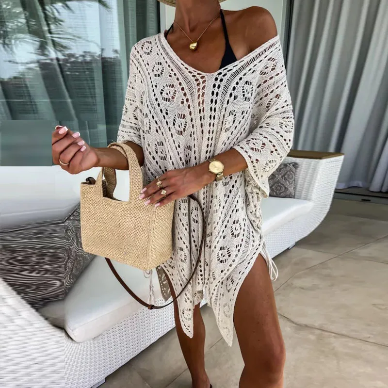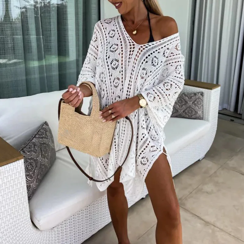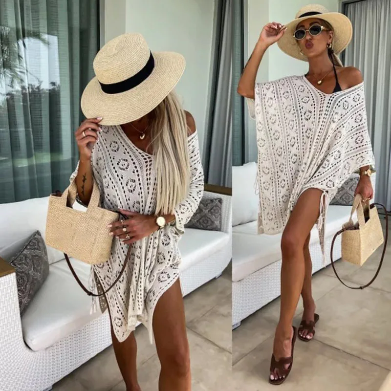 vmtvr Sexy V-neck Hollow Knit Women's Top Summer Solid Color Half Sleeved Loose Cover Up T-shirt Casual Vacation Sun Protection Shirt