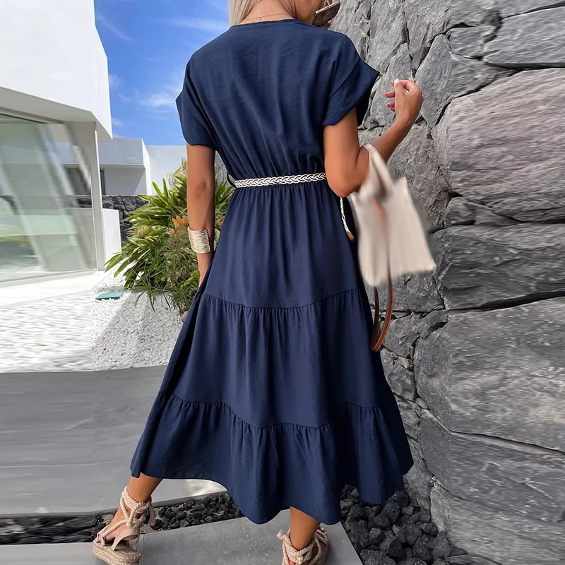 vmtvr Sexy Wrap V-neck Pleated A-Line Dress Women Spring High Waist Solid Office Lady Long Dress Summer Short Sleeve Boho Maxi Dresses
