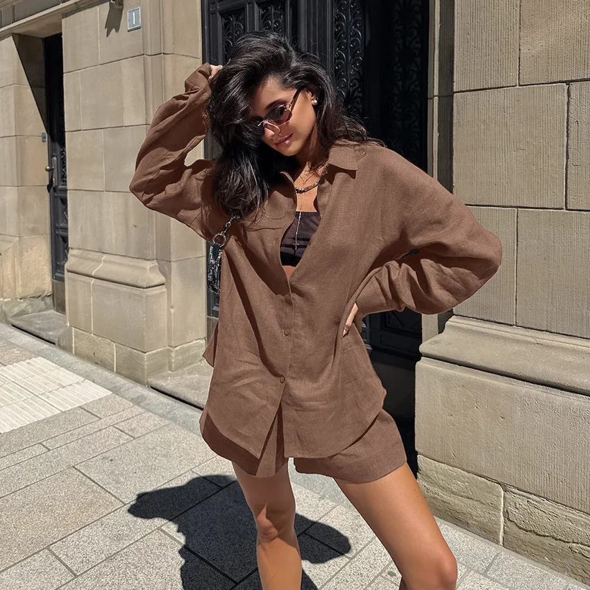 vmtvr Simple Women's Cotton Linen Suit Spring and Summer Women's Fashion Pleated Long Sleeved Shirt Loose Breathable Casual Shorts Set