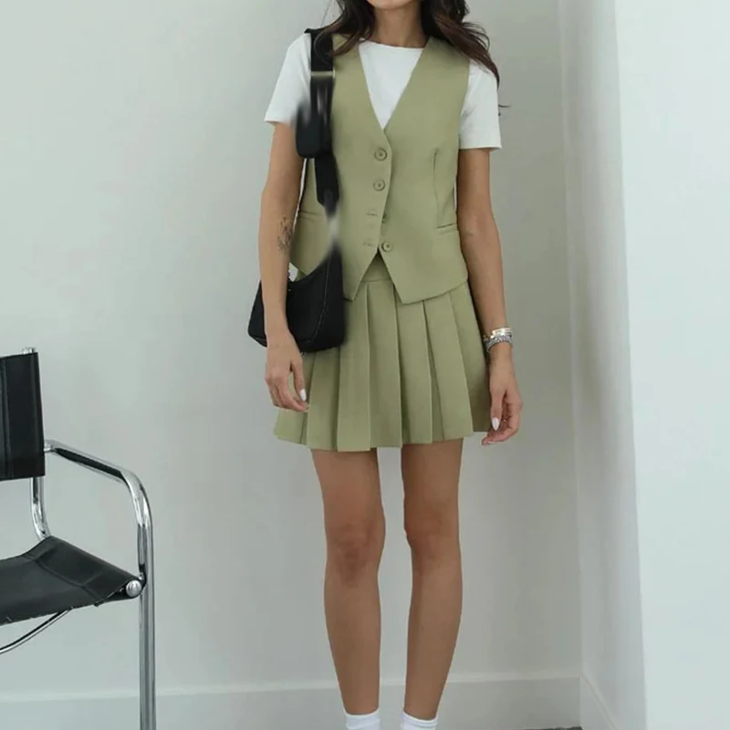 vmtvr Spring Summer Sleeveless Blazer Suit Women V Neck Button Tank Top Coat and Pleated Skirts Outfits Elegant Commuter Lady 2pcs Set