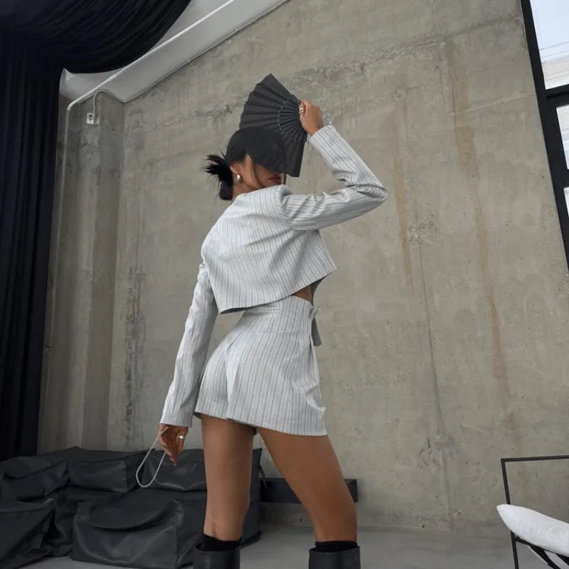 vmtvr Striped Deep V-Neck Short Set Spring And Summer Women's Sexy Long Sleeved Top High Waist Button Casual Pants Set